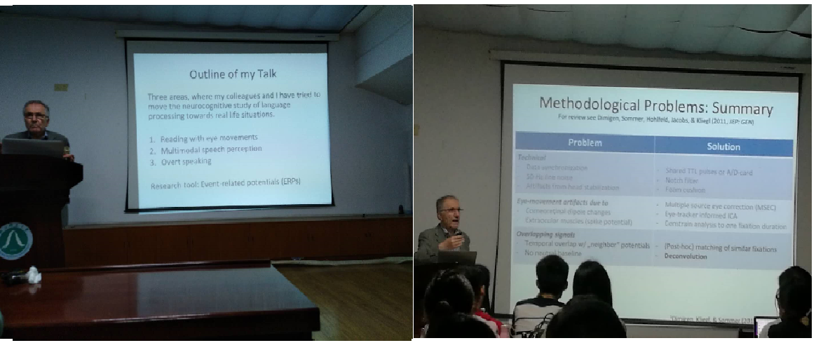 Werner Sommer教授分三个主题,详细介绍他们的课题组采用眼动和ERP结合技术的最新研究。同时介绍了这两种技术在自然言语认知加工研究中具备的方法学优势,以及展望如何利用这些优势来更好地研究言语加工。