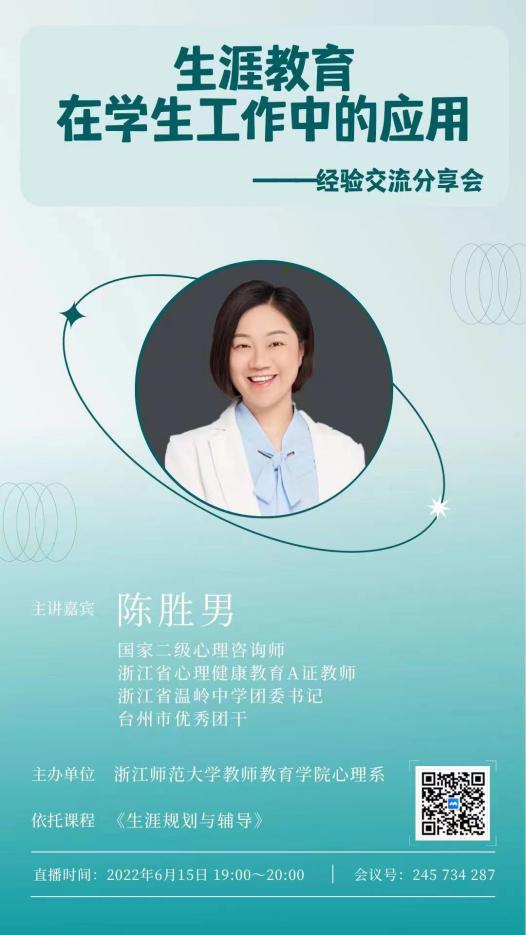 2022年6月15日晚七点,浙江省温岭中学的生涯老师兼心理老师陈胜男围绕“生涯教育”主题,为心理学系学生开展了一场意义非凡的线上经验分享交流会。