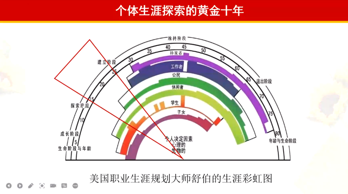 陈老师从今年浙江省高考作文题目开始切入,引出主题“生涯规划”。根据舒伯的生涯彩虹图可知,高中生处于个体生涯探索的黄金十年中(15-25岁)的初始阶段,大部分学生对于科目、专业、职业,甚至自己的兴趣和能力等的认识都还处于模糊状态。新高考改革实行后,学生高一就要做出七选三决策,这对大部分学生而言都是个巨大的挑战。在此情况下,高中生涯教育的重要性也就凸显而出了。