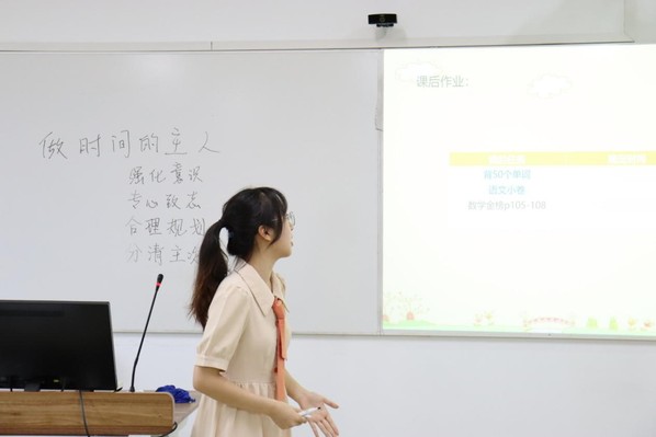 模拟课堂环节中,选手们的表现更是异彩纷呈。2号选手陆昱冰将“解决问题的方法”比作“雨滴”、将“学生们的目标”比作“大树”、“学习上的问题”比作“丢失的一角”,把问题当做成长的机会,雨滴会从丢失的一角滋润大树;10号选手张银秋的主题是“做时间的主人”,她通过对案例的分析,在与学生互动中教会学生时间管理的能力。