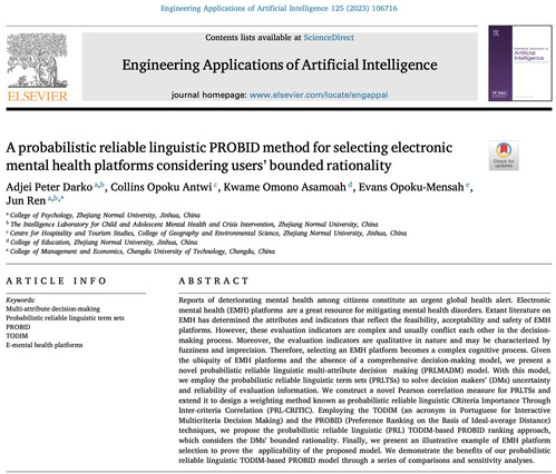 论文来源:Darko, A. P., Antwi, C. O., Asamosh, K. O., Opoku-Mensah, E., & Ren, J. (2023). A probabilistic reliable linguistic PROBID method for selecting electronic mental health platforms considering users’ bounded rationality. Engineering Applications of Artificial Intelligence, 125, 106716.