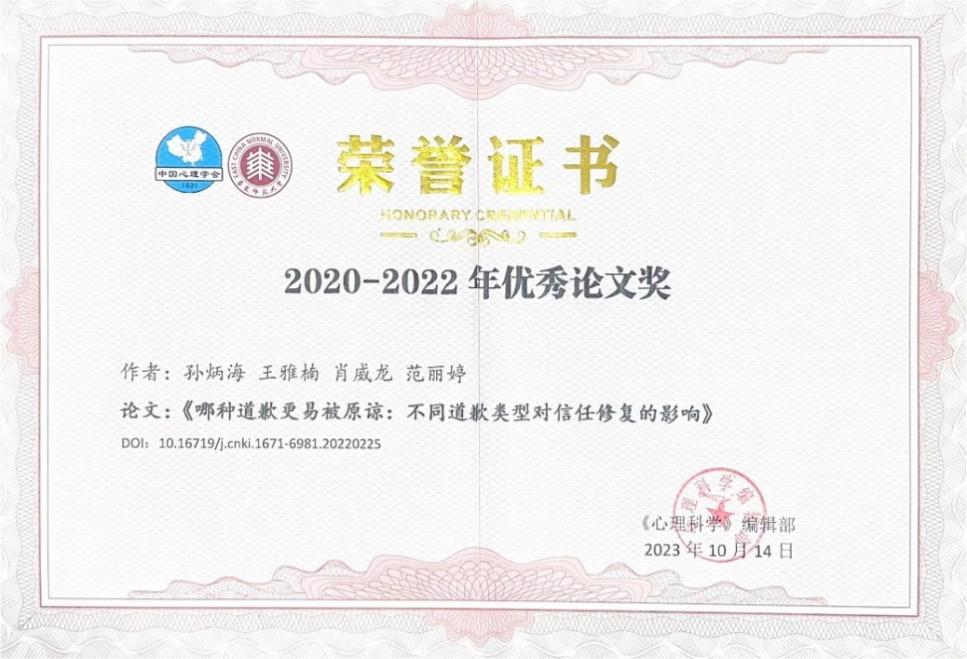 近期,新葡萄8883官网AMG博士研究生范丽婷撰写的论文《哪种道歉更易被原谅:不同道歉类型对信任修复的影响》获得《心理科学》2020-2022年度优秀论文奖。《心理科学》主编周晓林教授在10月14日举行的第二十五届全国心理学学术会议开幕式上宣读了获奖名单(共5篇)并进行颁奖。该研究得到国家社会科学基金重大项目《社会心理视角下新时代社会信任体系建设研究》(18ZDA165)的资助,是该重大项目的阶段性研究成果。