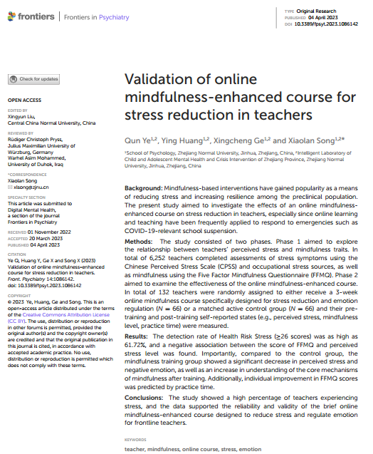论文来源:Ye, Q., Huang, Y., Ge, X., & Song, X. (2023). Validation of online mindfulness-enhanced course for stress reduction in teachers. Frontiers in Psychiatry, 14, 1086142.