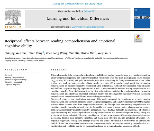 论文来源:Wenren, S., Ding, W., Wang, Z., Xia, Y., Xie, R.*, & Li, W. Reciprocal effects between reading comprehension and emotional cognitive ability. Learning and Individual Differences.