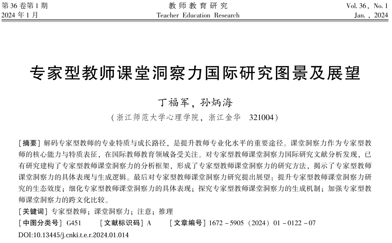丁福军和孙炳海在《教师教育研究》发文探讨专家型教师课堂洞察力研究新动向