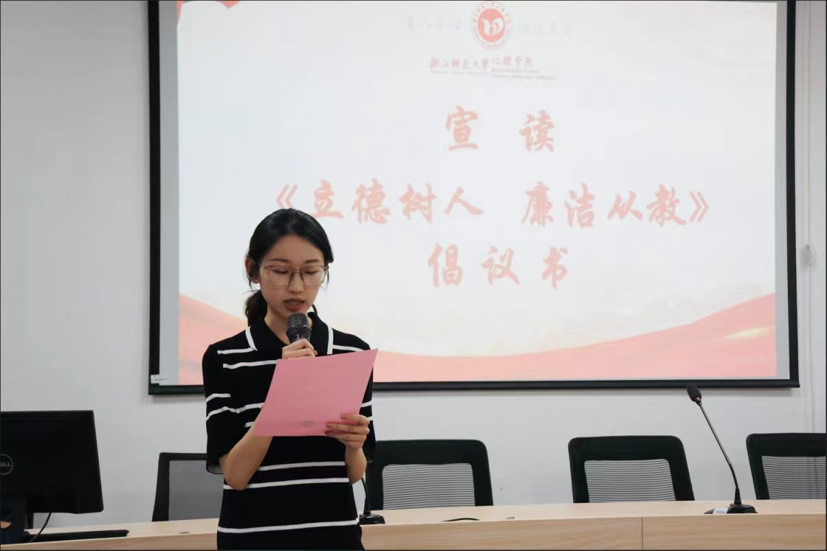 毕业生党员代表、应用心理学201班陆昱冰同学宣读了《立德树人廉洁从教》倡议书,呼吁毕业生党员要树立清正廉洁的价值观念,忠诚于党的教育事业,树立良好的师德师风。