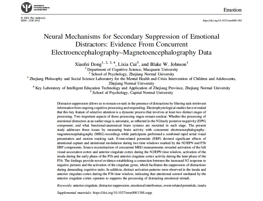 论文来源:Dong, X., Cui, L., & Johnson, B. W. (2024). Neural mechanisms for secondary suppression of emotional distractors: Evidence from concurrent electroencephalography–magnetoencephalography data. Emotion. Advance online publication. https://doi.org/10.1037/emo0001388.
