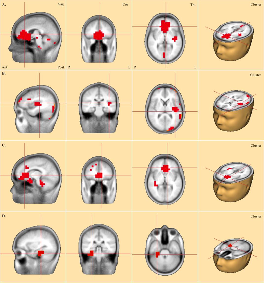 3 A.负性图片,EPN时间窗(276-390毫秒),前扣带回皮层,BA32B.负性图片,P3B时间窗(440-469毫秒),左侧脑岛,BA 22,41C.负性图片,P3B时间窗(470-490毫秒),扣带回皮质,BA 24D.中性图片,P3B时间窗(548-566毫秒),右侧旁海马回,BA 3536