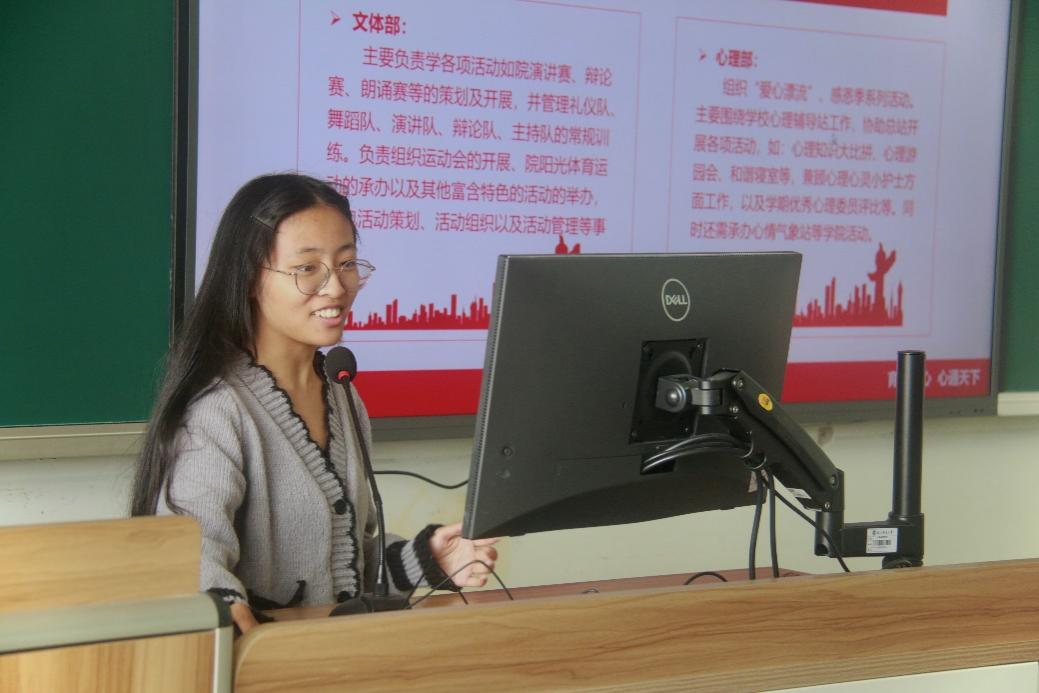 团务中心组织部部长陈玉梅强调了学风建设的内容。她围绕团务规范以及各部门间的分工合作展开了详细的介绍,强调每个部门需要组织好各部门的活动,提高成员的能力和积极性,确保各项工作顺利进行。