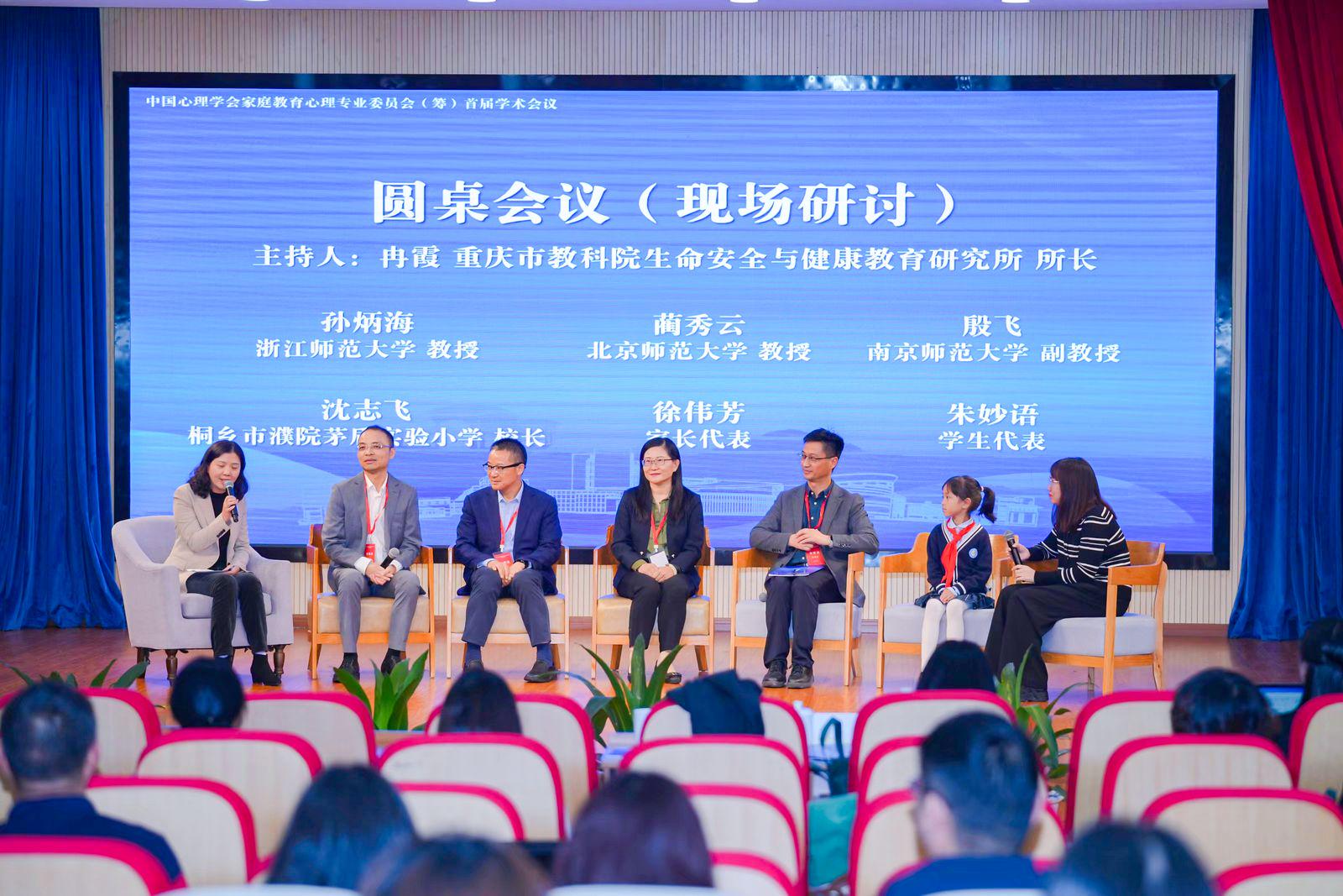 接着,小学组会场开展了圆桌会议的现场研讨。由重庆市教科院生命安全与健康教育研究所所长冉霞主持,北京师范大学蔺秀云教授、南京师范大学殷飞副教授和浙江师范大学孙炳海教授、桐乡市濮院茅盾实验小学书记校长沈志飞、家长代表徐伟芳和学生代表朱妙语围绕“小学校家社协同育人经验”议题进行了分享与交流。