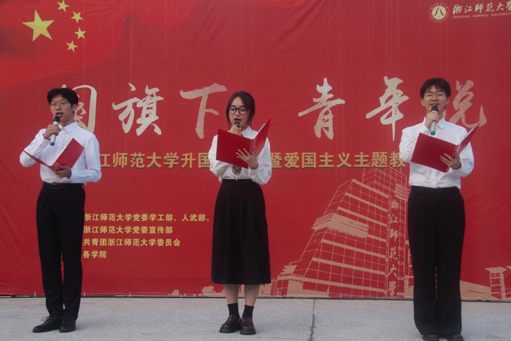 “让我们铭记历史的教诲,珍惜来之不易的幸福,让我们面向未来的征程,继续谱写新的辉煌。”窦苑星、金文皓和陈子豪三位同学带来了题为《丹青染就七十五,少年共谱中华图》的主题朗诵,庆祝中华人民共和国成立75周年,表达了青年一代对祖国的深厚情感和美好愿景。