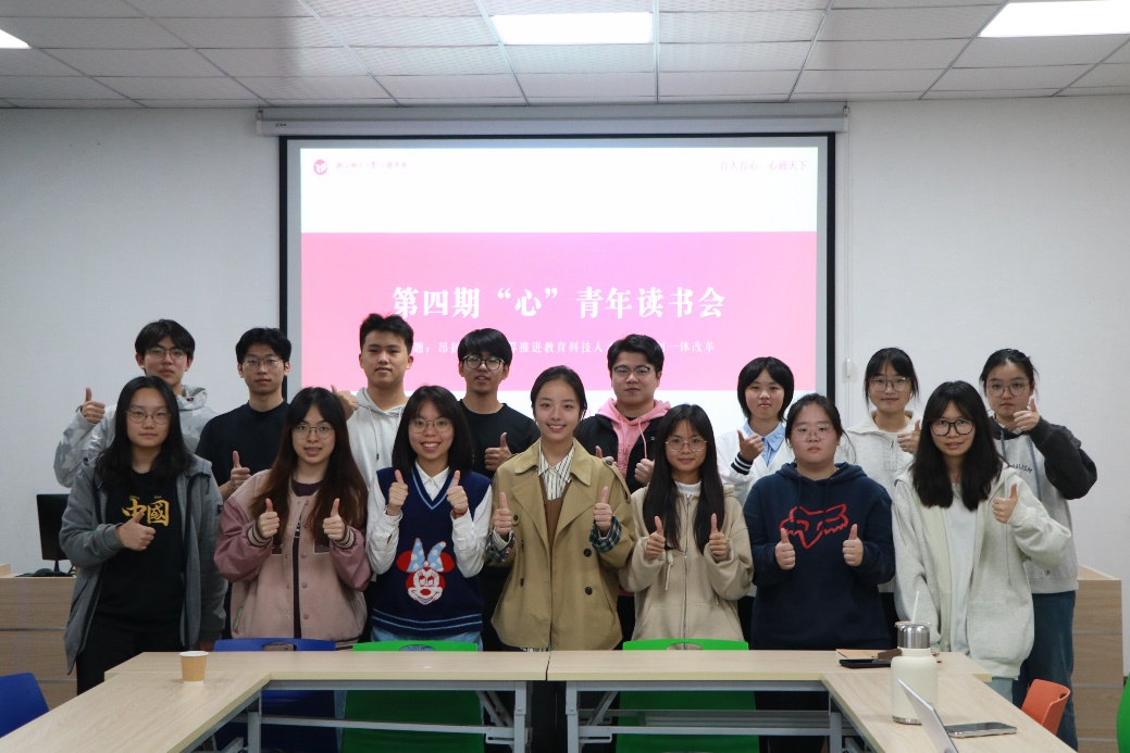 11月13日中午,新葡萄8883举行了第四期“心”青年读书会。本次读书会以《昂扬斗志,统筹推进教育科技人才体制机制一体改革》为主题,活动由学生会主席黄瑞瑜主持。学工办辅导员柏战老师出席会议,学院团委学生会主席团、学生会科研部、团务中心青大队全体成员参加会议。