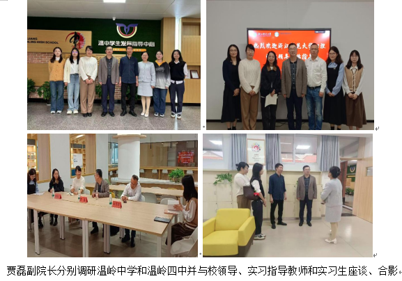 11月15日,贾磊副院长赴温岭实习基地看望实习生,在温岭市心理教研员李佩贞的陪同下,与温岭中学副校长陈世波、温岭四中校长应灵波、温岭三中指导教师陈蕾馨等人进行了深入交流和研讨,在温岭三中观摩了实习生的课堂教学汇报,并在温岭中学和温岭四中听取了各实习小组的实习汇报,详细了解实习生们的生活状况、实习内容以及在实习过程中遇到的挑战与收获。本次走访交流增进了双方对实习生实践情况的全面了解,也为下学期的实习方案和合作规划达成了进一步共识。