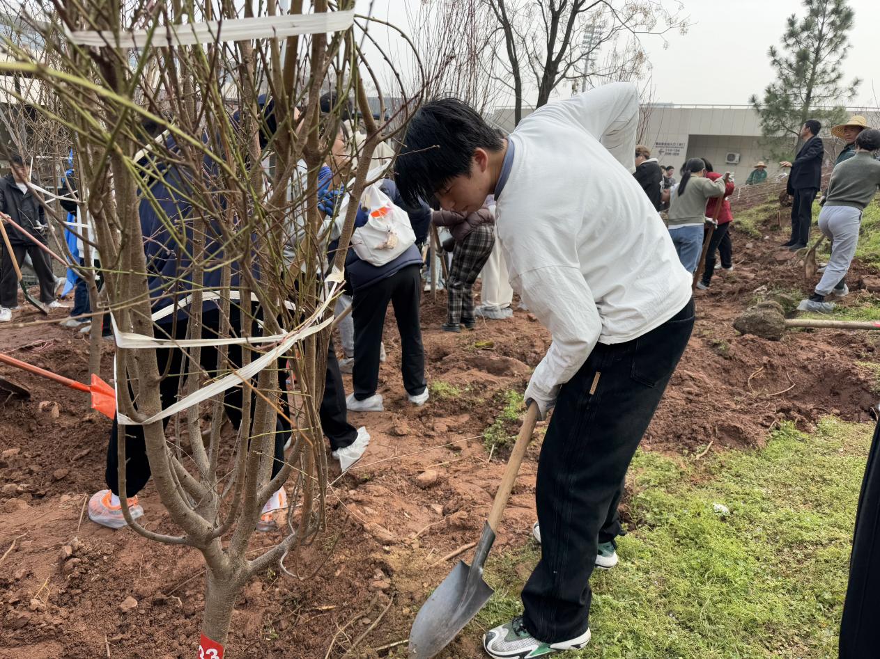 挖坑、浇水、填土,大家默契配合,种下一棵又一棵树。旧泥出,新植入,清水落,新生起。
