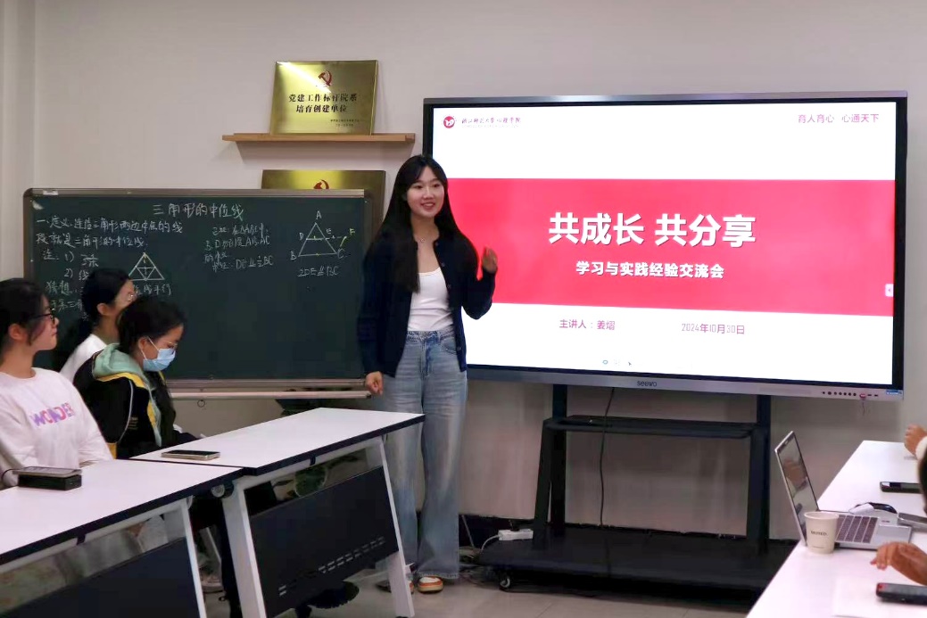 浙江师范大学第二十五届研究生支教团成员姜熠开展了以《共成长,共分享》为题的学习与实践经验分享。她从大一到大四的关键词入手,强调了大学生涯需要寻找到的三件事:一件热爱的事、一件值得思考的事、一件提前规划的事。同时,她表达了对学生会、团务中心成员的期望,希望大家在自己热爱的领域散发光和热。
