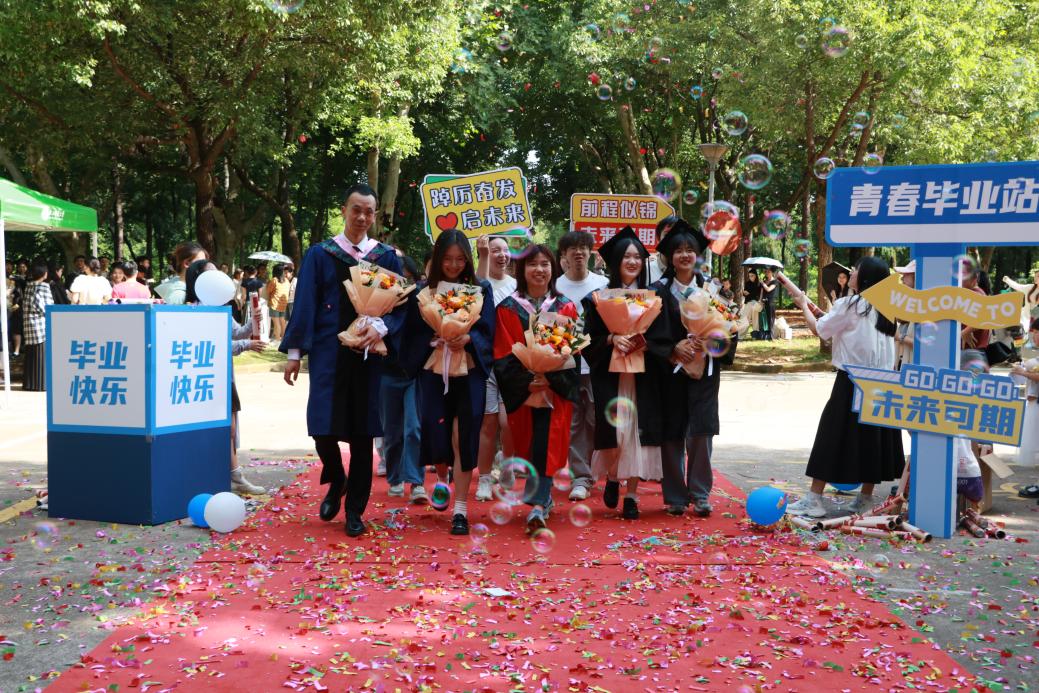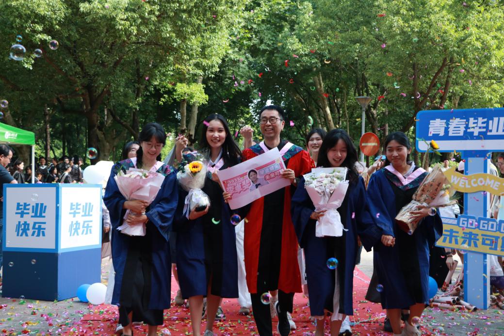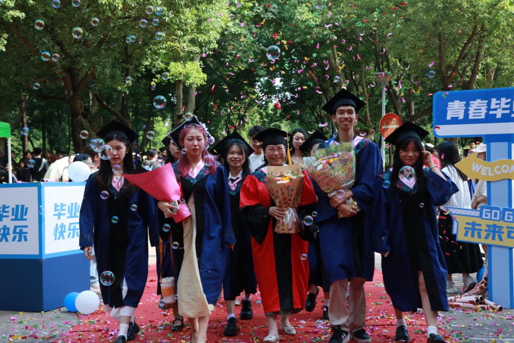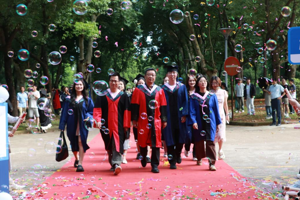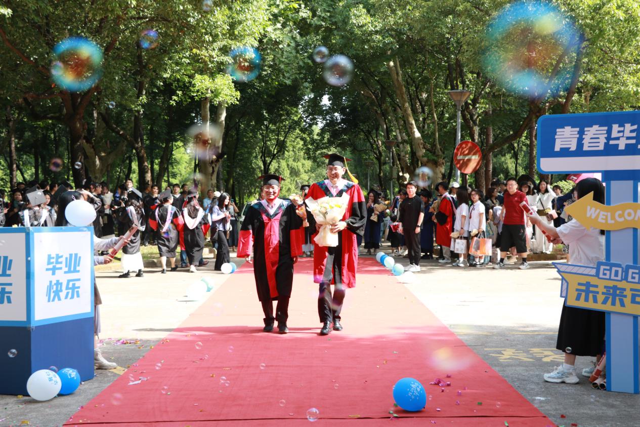 阳光轻洒,泡沫与彩带在空中轻盈飞舞;红毯铺展,荣耀与梦想在此汇聚。典礼开始前,2025 届毕业生在导师、班主任的带领下,意气风发地踏上红毯。他们身着学位服,面带笑容,迎接师长和同学们的鲜花与祝福,携手迈向充满无限可能的未来。