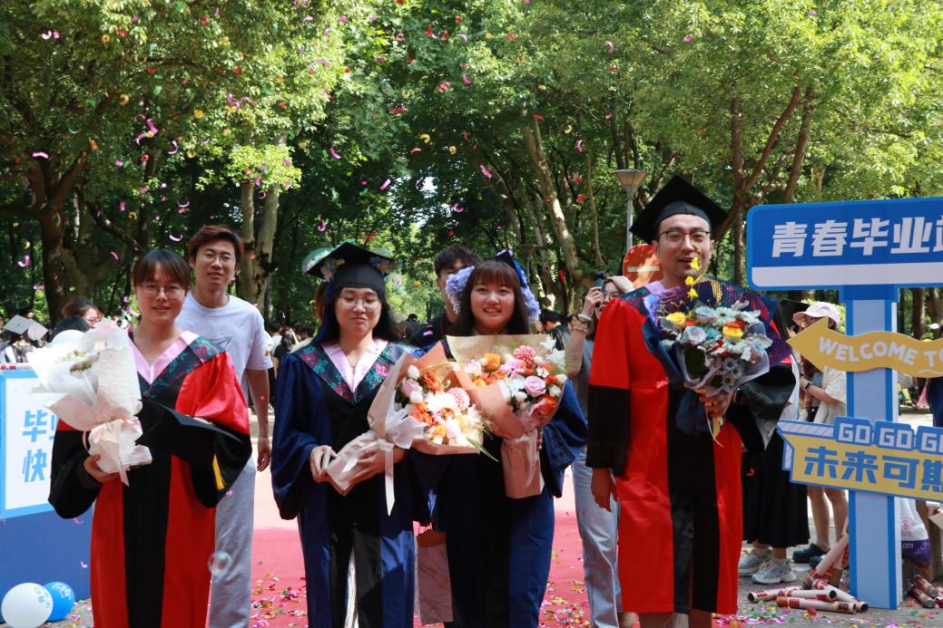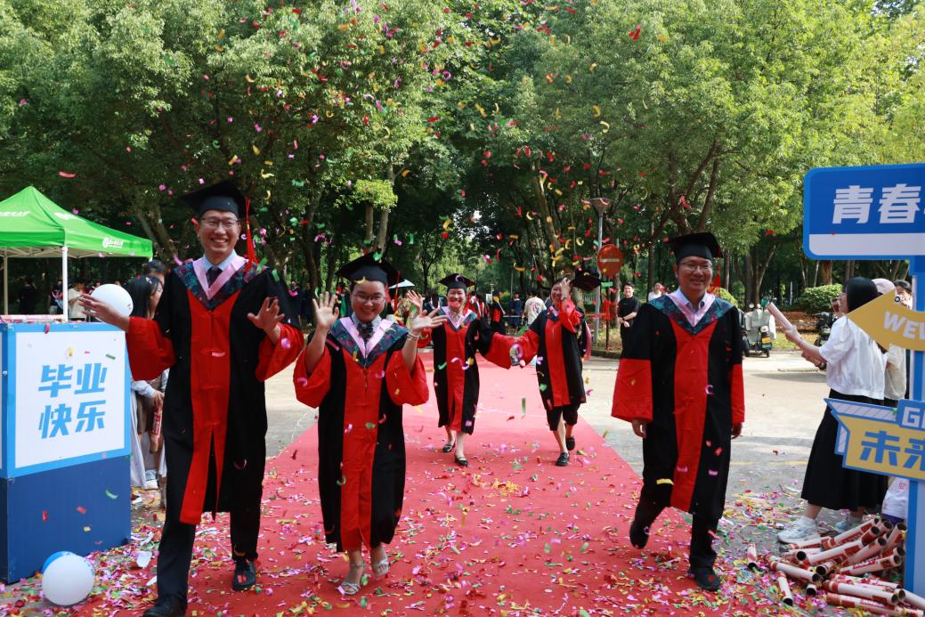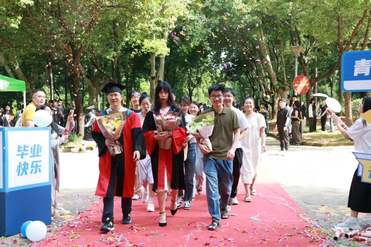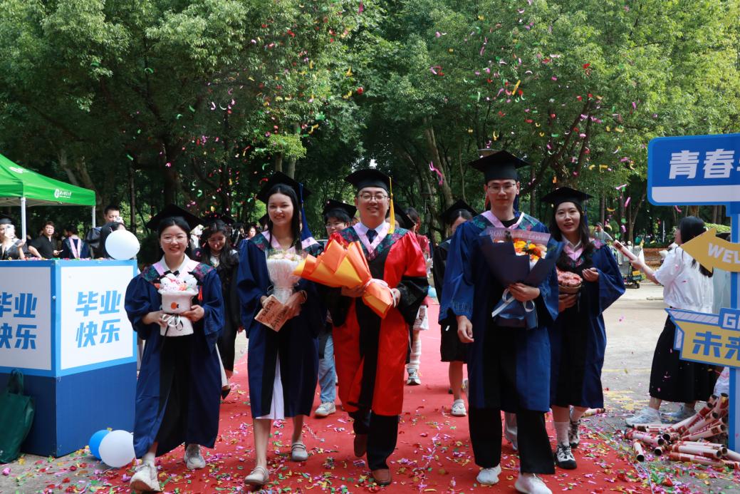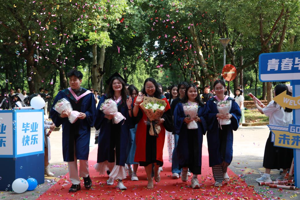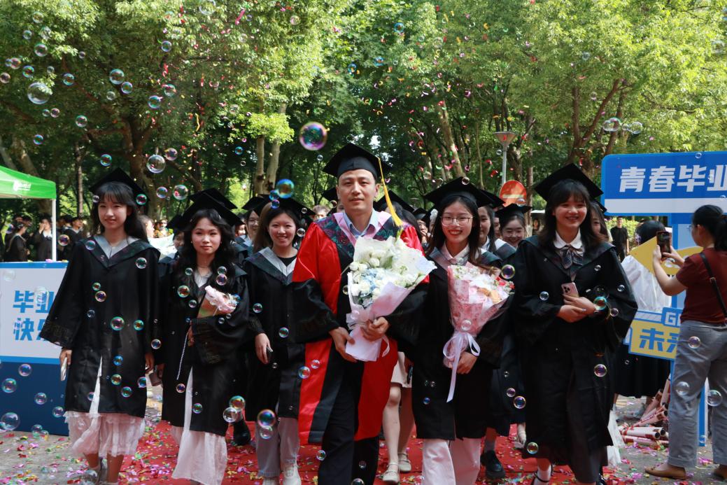阳光轻洒,泡沫与彩带在空中轻盈飞舞;红毯铺展,荣耀与梦想在此汇聚。典礼开始前,2025 届毕业生在导师、班主任的带领下,意气风发地踏上红毯。他们身着学位服,面带笑容,迎接师长和同学们的鲜花与祝福,携手迈向充满无限可能的未来。