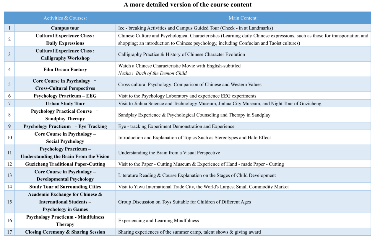 本次夏令营以“中国文化融入与心理学基础”为核心主题,设计了“学术精研”与“文化浸润”两大并行的课程模块,由学院孙炳海教授、汪俊教授、贾磊副教授领衔,汇聚12位跨领域专家组成的强大教学团队,课程内容涵盖社会心理学、发展心理学、文化心理学等核心理论,以及沙盘治疗、正念训练、认知神经科学实验操作等实践项目,还特别设置了中外学生学术研讨,激发跨文化学术灵感。