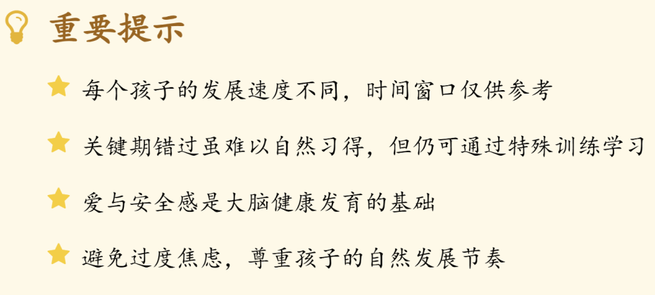 你知道为什么孩子学东西时快时慢吗?脑科学揭示,大脑并非匀速发育。特定时间段内,大脑对环境输入更敏感,神经回路塑造效率更高。这就是大脑发育关键期,不同能力发育关键期各有特点和不同,了解掌握它们,将更精准支持孩子成长。通过这些大脑发育时间表,我们能更清楚孩子大脑的成长节奏。这些黄金期,是生命赋予孩子的独特礼物,也是父母陪伴的宝贵机会。它不是一场竞赛,而是一段用心灌溉的旅程——用爱的语言滋养神经连接,用自由探索激发无限可能。理解规律,把握契机,就是给孩子最好的支持。