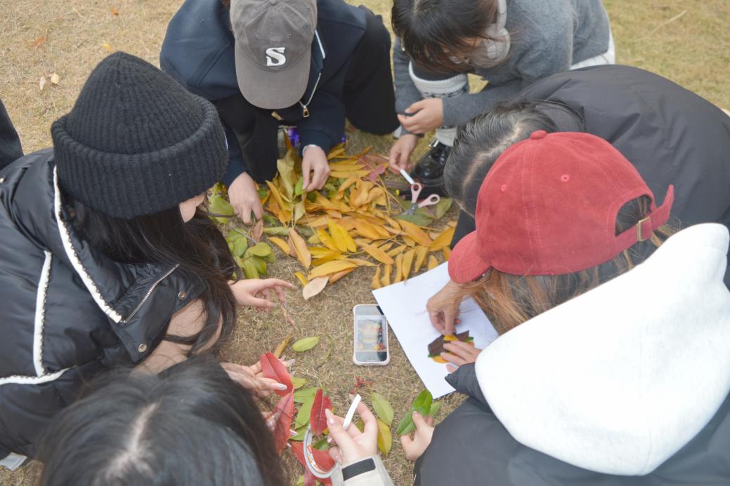艺术学院“秋季共创——落叶拼贴”:引导队员们利用收集的落叶进行集体艺术创作,将自然之美与团队智慧凝结于一幅幅拼贴画中。