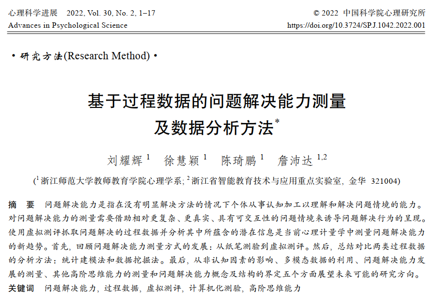 近日,浙江师范大学心理学系詹沛达副教授课题组在《心理科学进展》在线发表题为《基于过程数据的问题解决能力测量及数据分析方法》的综述论文。该论文的第一作者为我系2020级硕士研究生刘耀辉,詹沛达副教授为通讯作者。该论文部分内容受到国家自然科学青年基金项目(No. 31900795)的资助。