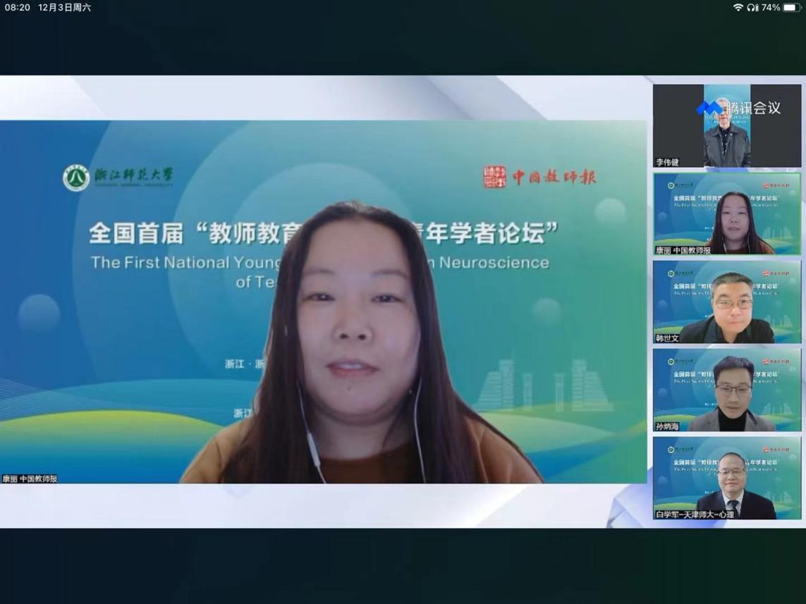 为促进教师教育的深度变革和教师培养质量的全面提升,12月3日,中国教师报和浙江师范大学教师教育学院、浙江省智能教育技术与应用重点实验室共同承办了全国首届“教师教育神经科学青年学者论坛”。本次论坛,群贤毕至,来自北京师范大学、华东师范大学、浙江大学、深圳大学等10余所高校的共15位嘉宾带来了精彩的报告。论坛以腾讯会议+中国教师报视频号直播形式进行,本次论坛引起了社会广泛的关注和参与,直播当天累计观看人次约2万人次,累计点赞人次2万多次,取得了很好的社会影响力。