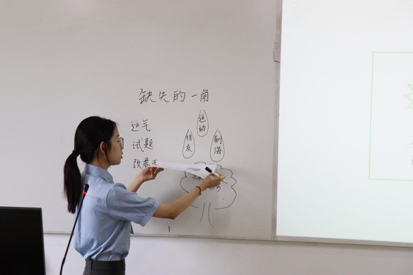 模拟课堂环节中,选手们的表现更是异彩纷呈。2号选手陆昱冰将“解决问题的方法”比作“雨滴”、将“学生们的目标”比作“大树”、“学习上的问题”比作“丢失的一角”,把问题当做成长的机会,雨滴会从丢失的一角滋润大树;10号选手张银秋的主题是“做时间的主人”,她通过对案例的分析,在与学生互动中教会学生时间管理的能力。