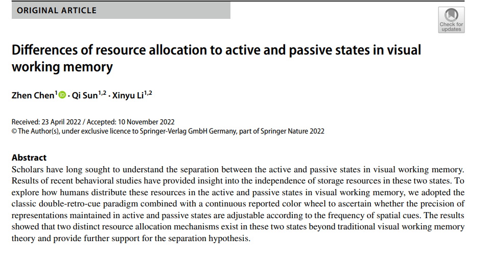 Chen, Z., Sun, Q., & Li, X. (2023). Differences of resource allocation to active and passive states in visual working memory. Psychological Research, 87, 1761–1767.