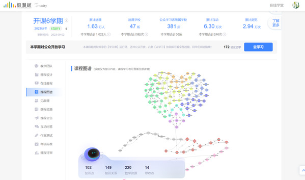 知识图谱是以可视化的方式展现知识关系网络,以结构化的形式描述课程内所包含的知识点、教学资源、教学活动、测评方式之间的关系,具有知识管理、学习导航、学习评估等功能,帮助学生更全面、更系统地了解课程知识点,提升学习效率,实现个性化精准学习。