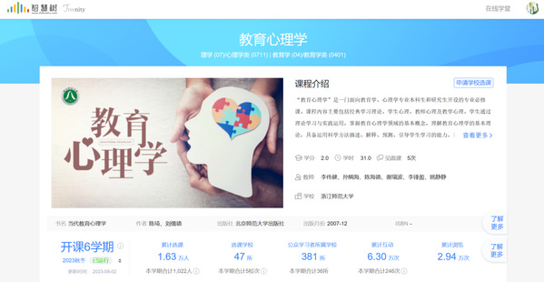《教育心理学》作为浙江省一流课程和应用心理学专业核心课程,在筹划和建设课程知识图谱的过程中,团队成员一起研讨教学创新,聚焦课程目标、知识框架、学习逻辑等关键,拆解、细化专业知识,结合线上线下混合式教学实施情况,系统梳理了102个知识点,构建了149个知识关系,扩展了220个教学资源,14个思政要点,包含了教学资源层、知识体系层、问题体系层、能力体系层等4个维度,将教育心理学的各个知识点有机地联系起来,形成了一个完整的、多维度的知识网络。同时基于人工智能技术和自然语言处理算法,在学生的实际学习活动中不断优化和更新问题图谱,促使学生将知识点整合为系统性的知识结构,激发学生思考和建立学习本门课程的个性化知识图谱。目前《教育心理学》课程已向全国开放,服务47所高校1.63万名学生。
