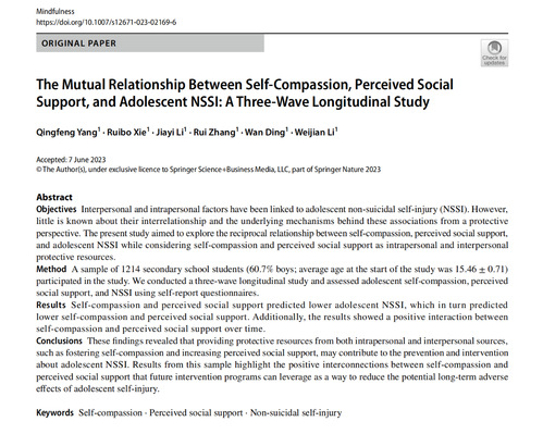 论文来源:Yang, Q., Xie, R., Li, J., Zhang, R., Ding, W., & Li, W. (2023). The Mutual Relationship Between Self-Compassion, Perceived Social Support, and Adolescent NSSI: A Three-Wave Longitudinal Study. Mindfulness, 1-11.