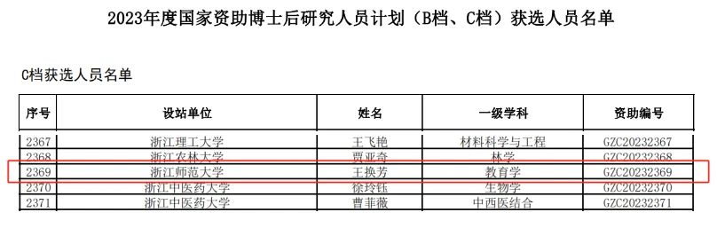 12月18日,全国博士后管委会办公室、中国博士后科学基金会发布了《关于印发2023年度国家资助博士后研究人员计划(B档、C档)获选结果的通知》,我院博士后王换芳主持的项目《“双减”改革中的教师情绪劳动困境:现状、机制与干预路径研究》获C档资助,也是本次我校获得的唯一的项目,项目合作导师为李伟健教授。