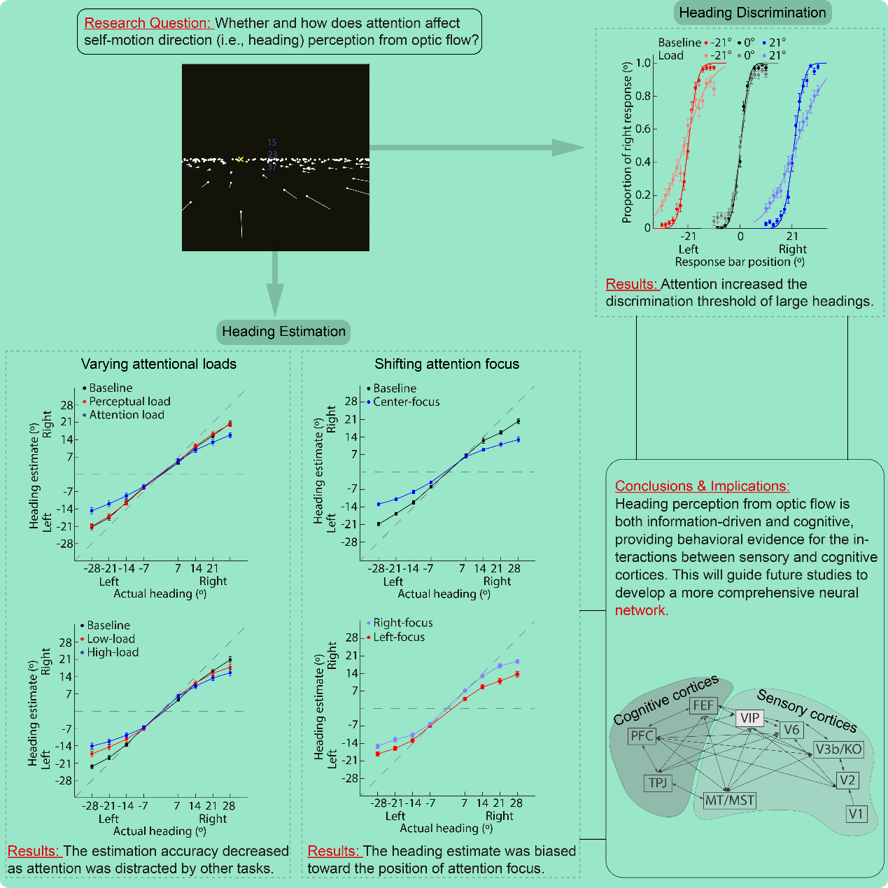 基于光流的自身运动方向感知的认知机制一直以来是视知觉领域的热点问题。早期研究者普遍认为该视觉过程是纯知觉性的,信息驱动的过程。不需要诸如注意、工作记忆、决策等认知过程的参与。随着认知神经科学的发展,灵长类动的研究发现负责光流加工的脑区(如MST)内的神经元活动会受到注意的调节。当注意资源被其他任务分配后,神经元活性会减弱,且神经元的最佳激活刺激距离注意焦点位置越远则活性越弱。然而,没有行为研究对注意对基于光流的自身运动方向感知过程展开系统回答。为此,孙琪博士团队开展了3个系列实验。结果发现,注意主要影响与注意焦点位置相隔超过14度的自身运动方向的感知;感知到的运动方向会系统地向注意焦点位置压缩;当注意负载增加时,方向估计的准确性下降,辨别阈限上升。该研究系统揭示了注意影响基于光流的自身运动方向感知的行为机制,证明该感知过程是一个信息驱动和认知双属性的过程。