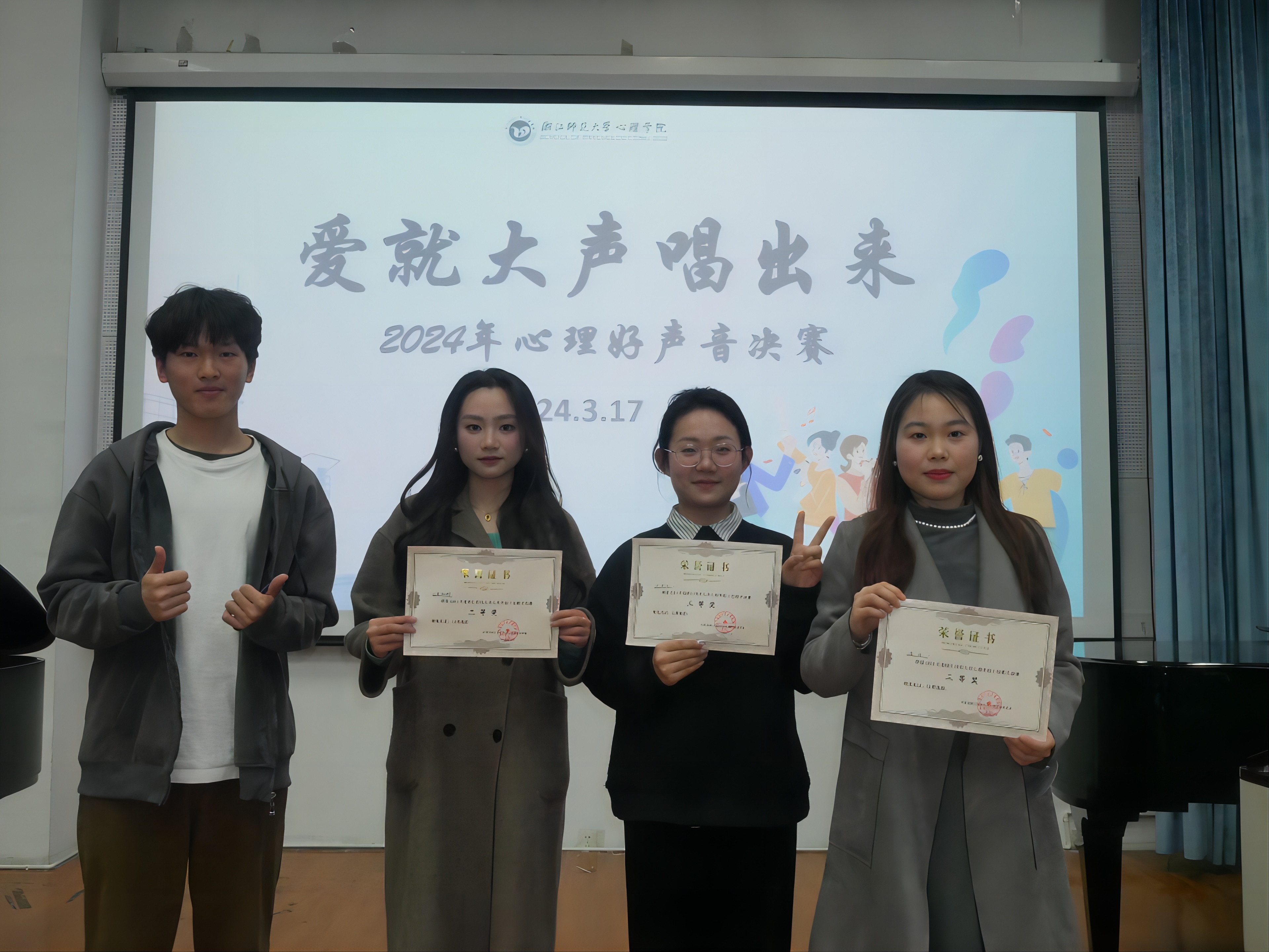 3月17日下午,心理学院校园好声音决赛在19幢音乐楼301室举行。艺术学院辅导员严刘鑫,新葡萄8883辅导员柏战,艺术学院文艺部部长童启鸣,艺术学院音乐学专业生胡洲瑞,新葡萄8883策划部部长蒋涵萱担任本次赛事评委。