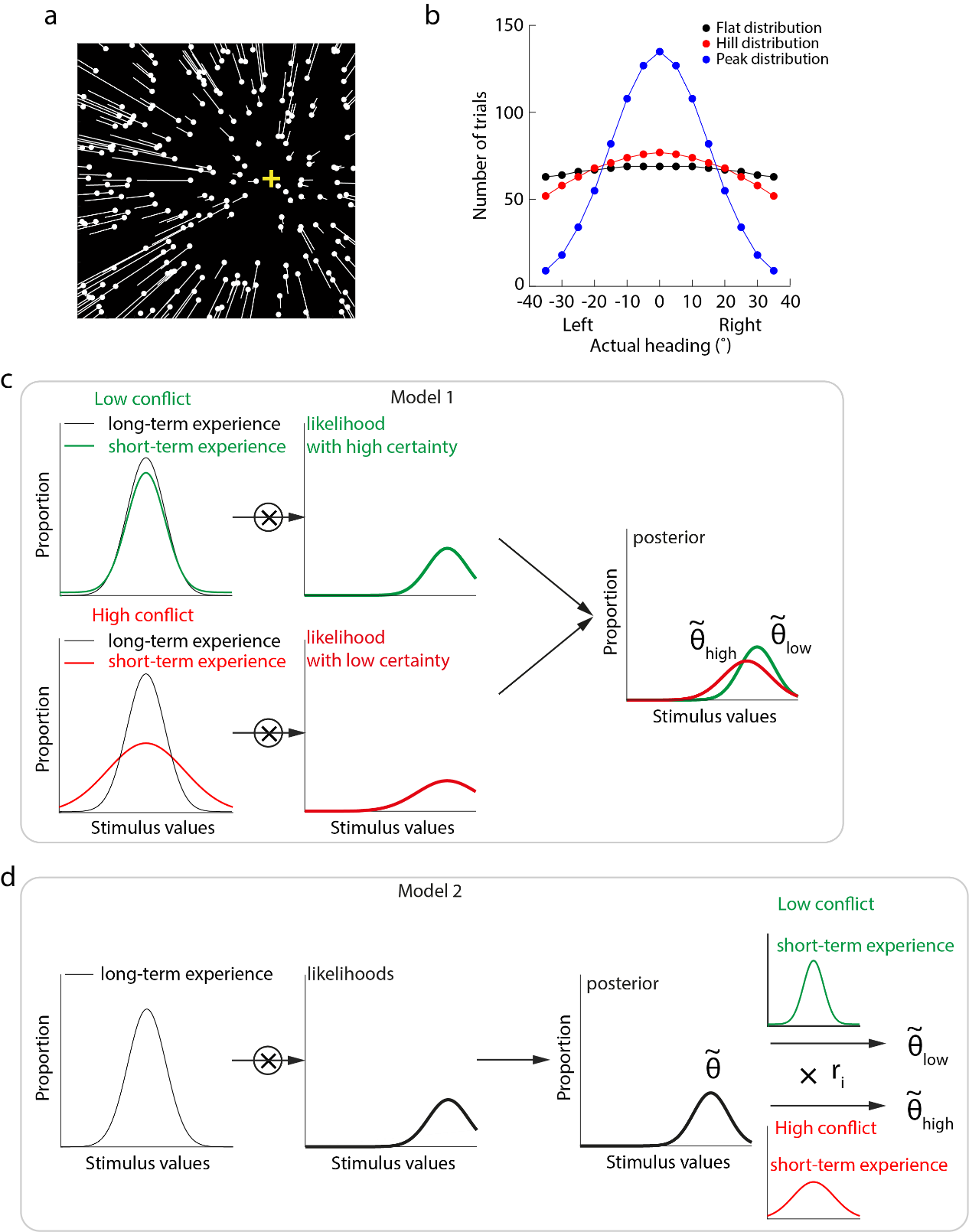 为此本研究邀请了三组被试根据光学运动信息(光流,图a)来判断自身运动方向。已有研究证明,在漫长进化过程中,人类形成了关于自身运动方向表征的长时经验,其分布近似于图b中的蓝色线条。因此,如果实验中的自身运动方向试次数按照蓝色线条描述的形式进行分布时,我们假设长时经验和短时经验没有冲突或冲突最下。此外,我们让试次分布按照图b中红色和黑色线条进行分布,就创设了短时经验和长时经验不同程度的冲突。其中黑色线条经验冲突最强。