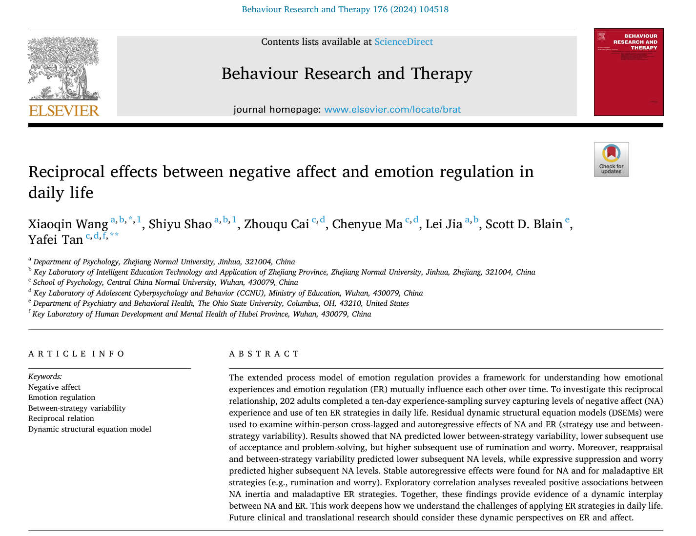 近期,新葡萄8883官网AMG王小琴课题组和华中师范大学谈雅菲副研究员在期刊《Behaviour Research and Therapy》(中科院二区TOP,JCR Q1,5-IF = 5.5)合作发表了题为《Reciprocal effects between negative affect and emotion regulation in daily life》的学术论文。王小琴和我院2022级硕士研究生邵施雨为论文共同第一作者;王小琴和谈雅菲为本文共同通讯作者。该研究得到了国家自然科学基金项目(32200831)的资助。论文来源:Wang, X., Shao, S., Cai, Z., Ma, C., Jia, L., Blain, S. D., & Tan, Y. (2024). Reciprocal effects between negative affect and emotion regulation in daily life. Behaviour research and therapy, 176, 104518.文章链接:https://doi.org/10.1016/j.brat.2024.104518