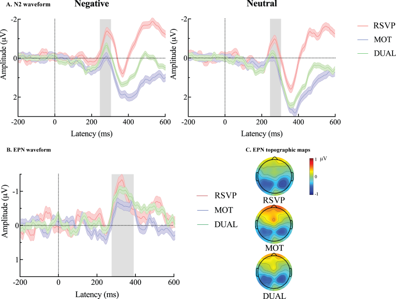 图1 A.在不同情绪图片下,不同任务条件中N2和EPN的ERP;B.在不同情绪图片下,不同任务条件中N2和EPN的ERP;C.不同任务条件下的EPN地形图。