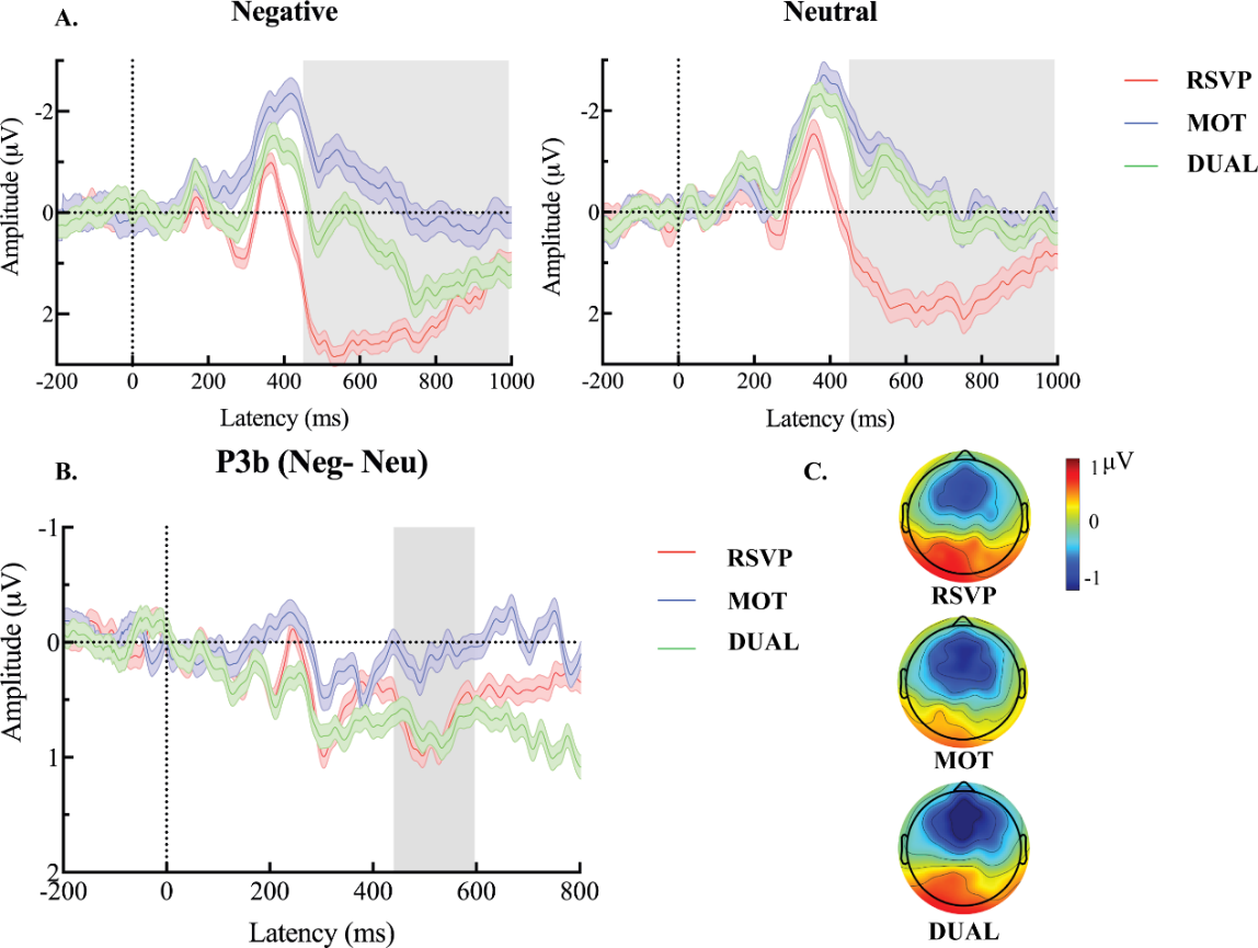 EEGMEG的结果进一步证明这一观点。事件相关电位(ERP)分析发现负性图片在在N2/EPN时间窗和P3b时间窗均引起了更大的振幅,但在MOT任务中,负性与中性的差异不显著,这可能表明在高认知负荷下,注意系统能够更有效地抑制情感干扰物。