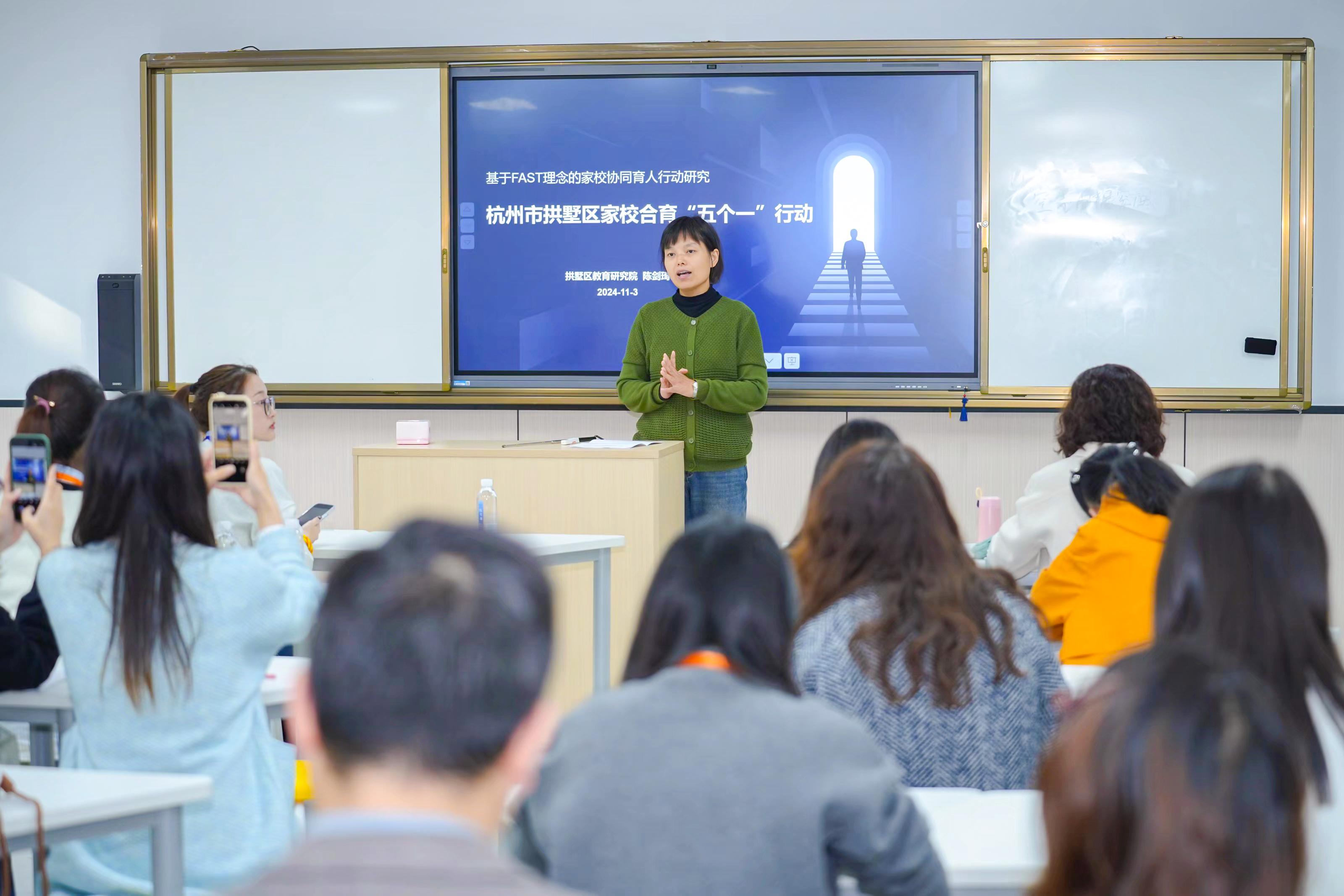 最后,中学组平行分论坛进行实践分论坛,由安徽师范大学全莉娟教授主持。温岭市教育局局长叶永峰作《构建校家社五维体系,谱写携手育人新篇章》报告、杭州市上城区教育局副局长王世美作《“幸福成长圈”——校家社协同育人的上城行动》报告、金华教育学院党委书记吴惠强作《校家社协同育人机制的金华探索》报告、天津科技大学心理健康教育与咨询中心副教授林琳作《家校社协同联动促进学生健康发展路径研究》报告、桐乡市第二高级中学校长姚海权作《桐乡二中“崇德尚合”家校共育的实践探索》报告、杭州市萧山江南初级中学德育副主任贺敏和校长陈向红作《萧山江南初中全员家庭教育指导的探索》报告。