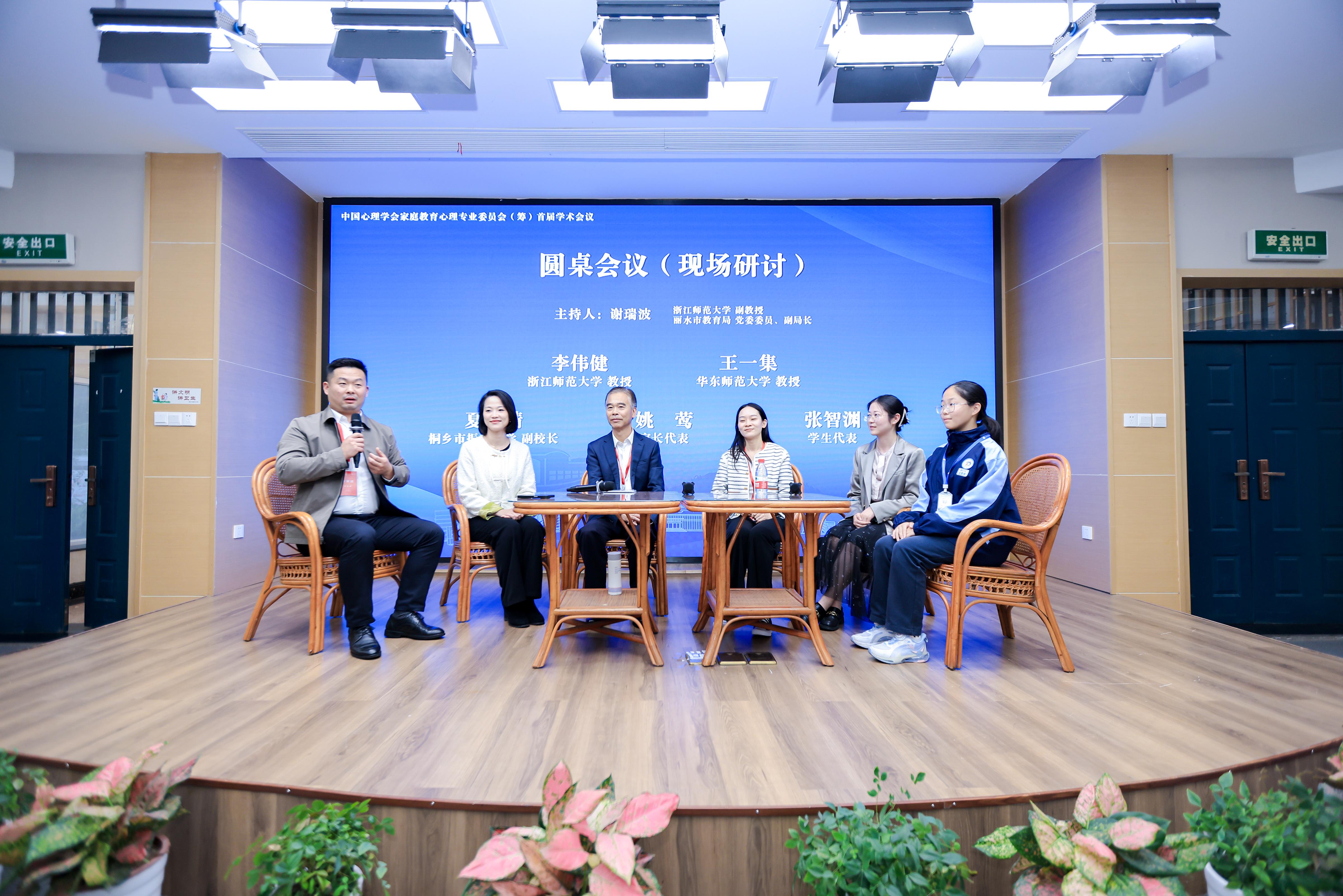 接着,中学组平行分论坛进行圆桌会议。由新葡萄8883官网AMG谢瑞波副教授主持,中国心理学会家庭教育心理专业委员会筹委会负责人李伟健教授、华东师范大学王一集教授、桐乡市振东中学副校长夏婧、家长代表姚莺与学生代表张智渊围绕“中学校家社协同育人经验”议题进行了分享与交流。