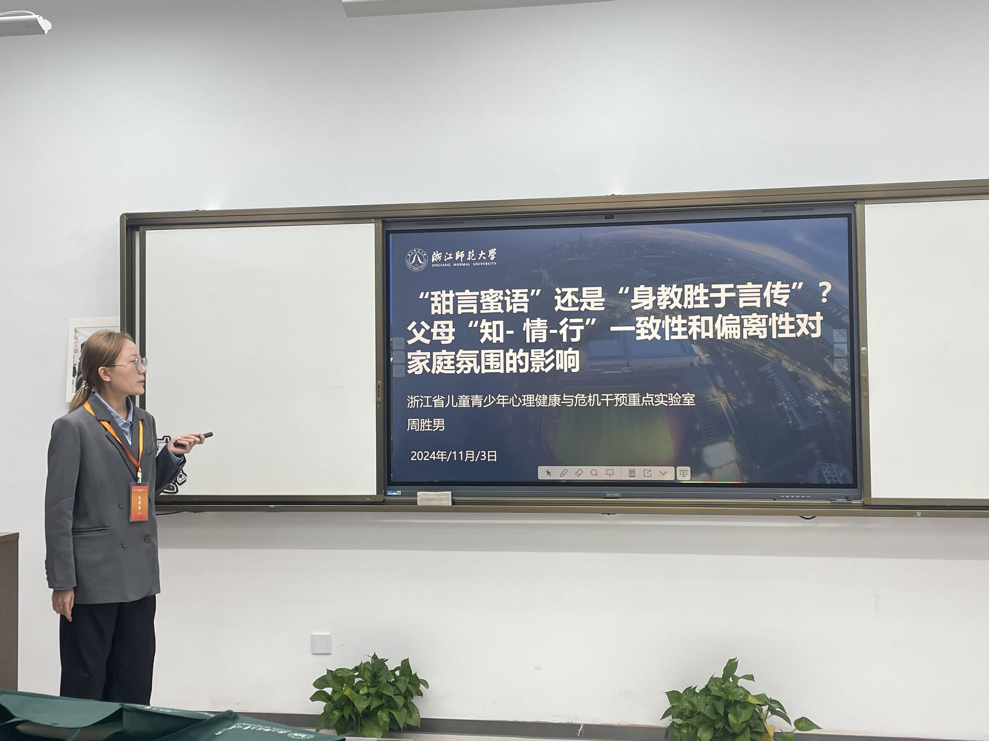 中学组平行分论坛中首先开展桐乡市校家社协同育人经验介绍活动,由华东师范大学王一集教授主持。心理健康服务站站长姚敏钰做《桐乡市校家社协同育人经验介绍》报告、桐乡市振东中学书记朱新江做《三环递进:打造“十二度”校家社协同育人振中样态》报告。
