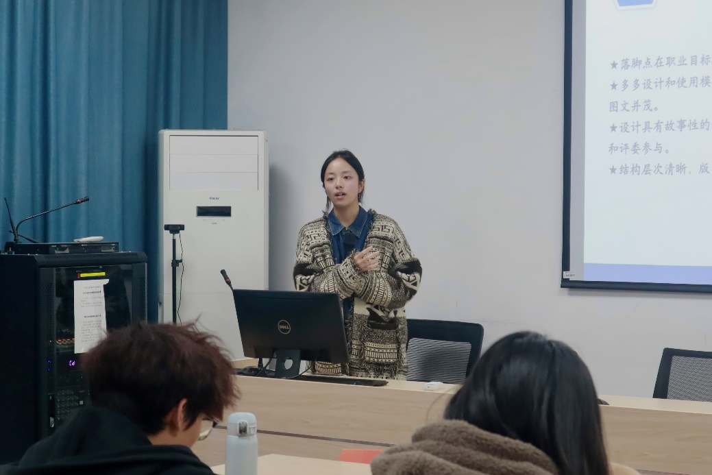在经验分享方面,王维苑同学细致说明了职业选择需要注意的事项以及生涯发展报告的格式。她强调了确定职业目标时的“新”、“重”、“专”的三大原则,并详细讲解了生涯发展报告的封面设计要素及主体内容。同时,她提醒同学们要做好准备应对评委提问,特别是行业趋势、个人竞争力等企业界关键领域的提问。