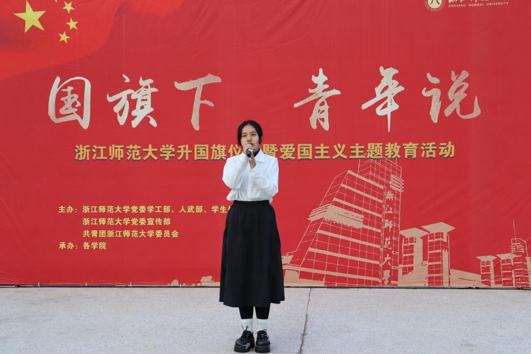 “让我们铭记历史的教诲,珍惜来之不易的幸福,让我们面向未来的征程,继续谱写新的辉煌。”窦苑星、金文皓和陈子豪三位同学带来了题为《丹青染就七十五,少年共谱中华图》的主题朗诵,庆祝中华人民共和国成立75周年,表达了青年一代对祖国的深厚情感和美好愿景。
