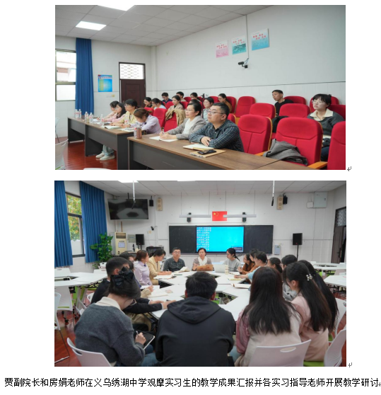 11月13日,在义乌教育局和五所实习校的大力支持下,贾磊副院长和房娟老师在义乌绣湖中学观摩了实习生们的教学成果汇报。义乌春晗学校指导教师贾斌芳、义乌公学指导教师李慧、上溪中学指导教师李陈玲、绣湖中学指导教师金雅莉、楂林小学指导教师陈斐和北苑中学指导教师朱博远在现场指导观摩。义乌基地实习生们展示了他们精心准备的课程,体现出实习实践中的专业成长与教学创新。在随后的教学研讨会上,双方领导和指导教师对实习生们的教学表现提出了专业且富有建设性的反馈和建议。