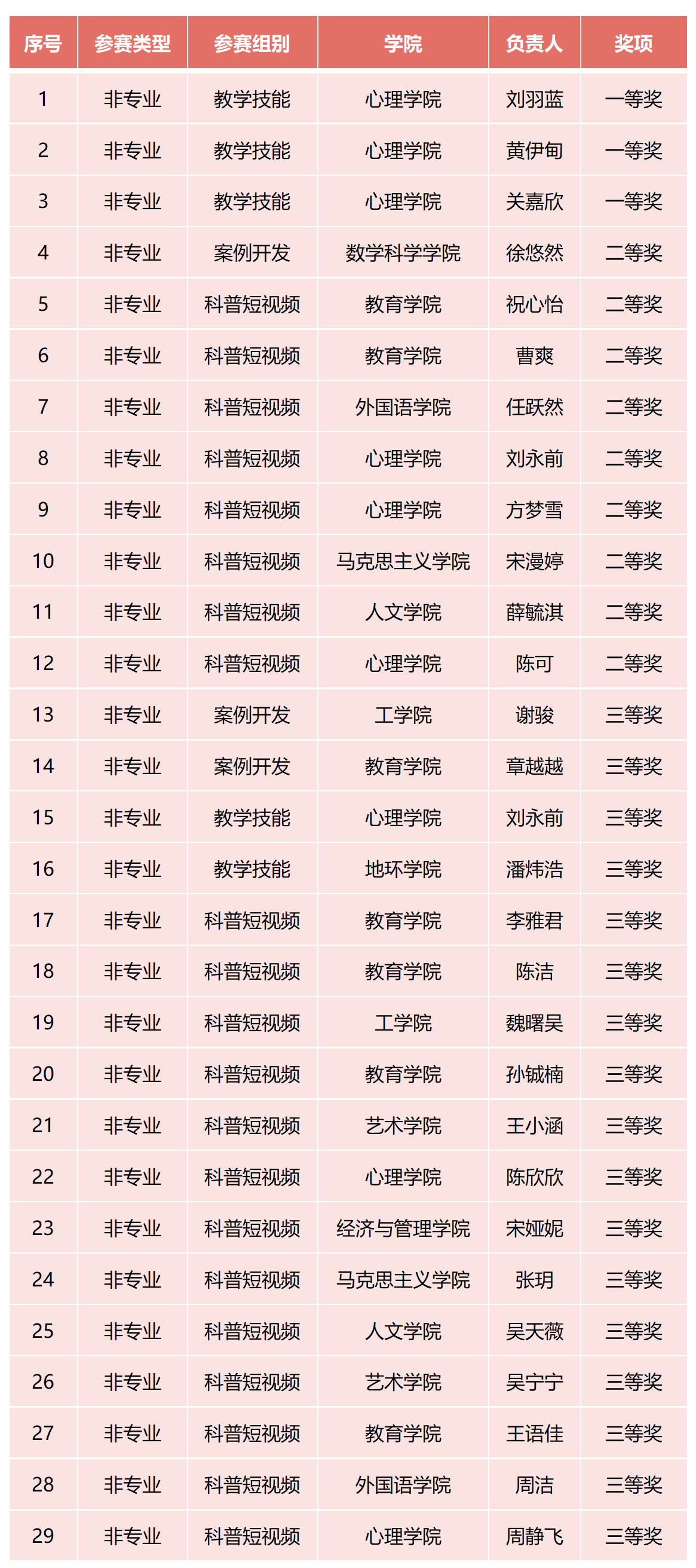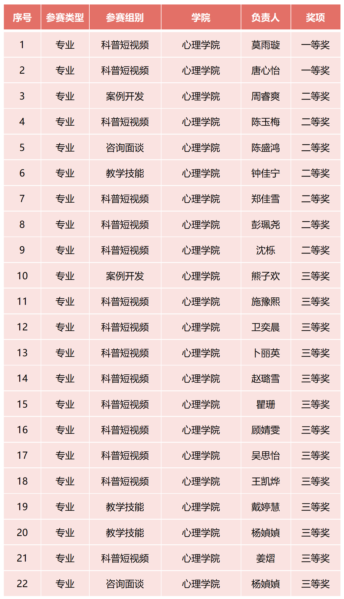本次大赛分专业组、非专业组两个组别进行评比,专业组面向应用心理学本科生及应用心理专业学位在读硕士研究生(参赛个人、团队成员均为应用心理硕士研究生),非专业组面向除专业组外其他在校本科生、硕士研究生。大赛共收到来自全校各学院学生的参赛作品101项,其中专业组44项,非专业组57项。根据比赛规则,经专家评审,共评选出一等奖5项、二等奖16项、三等奖30项。
