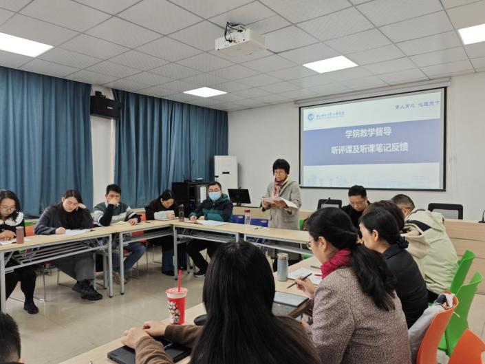 教学督导李锋盈、王立君两位老师深入分析了老师们在教学过程中教学方法运用、教学内容安排、课堂互动效果以及教学进度把控等情况,肯定了青年教师对教学互动的重视和改善。施丽君老师就本学期同学们本科课程教学中提出问题向老师们进行了反馈;朱婷老师反馈了本学期研究生课堂教学中反映的问题。副院长汪俊、贾磊与老师们积极聆听和探讨教学督导和学生反馈的问题,讨论和布置了学院下学期重点教学工作。老师们对教学工作进行了深入交流和互相探讨,后续将积极反思切实完善,持续提升课堂教学能力。