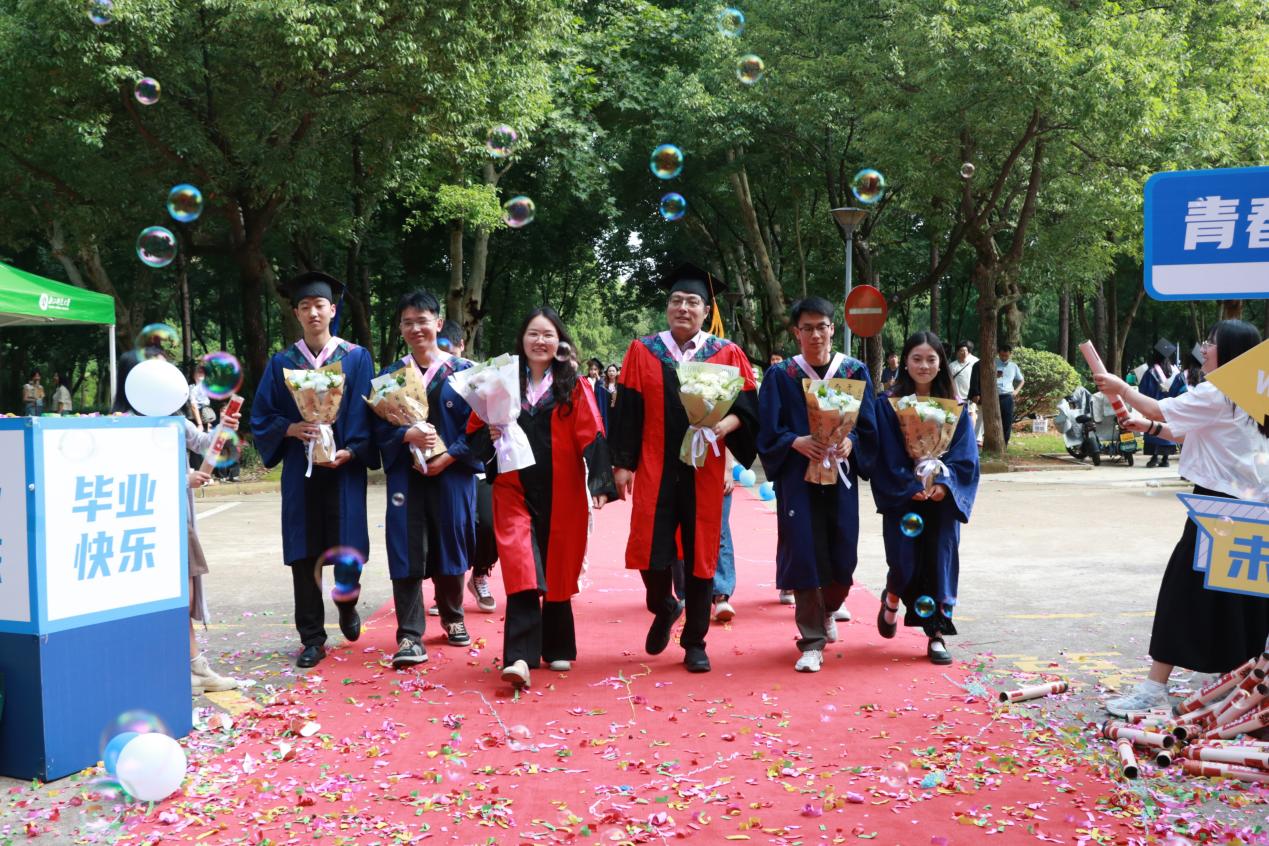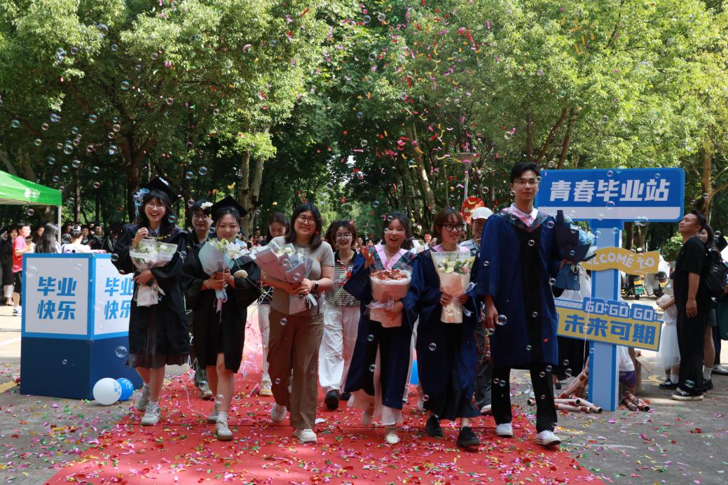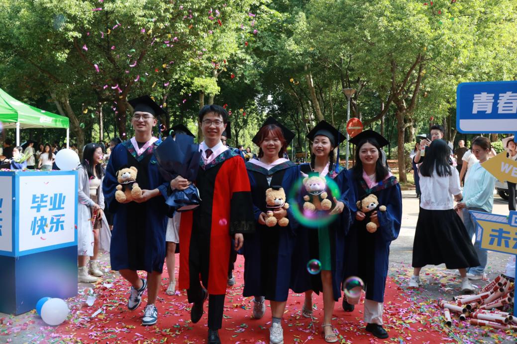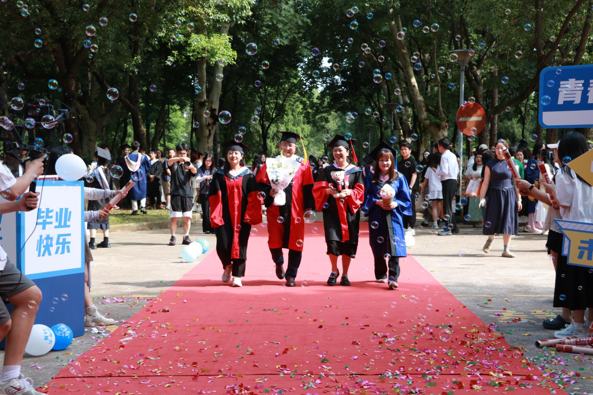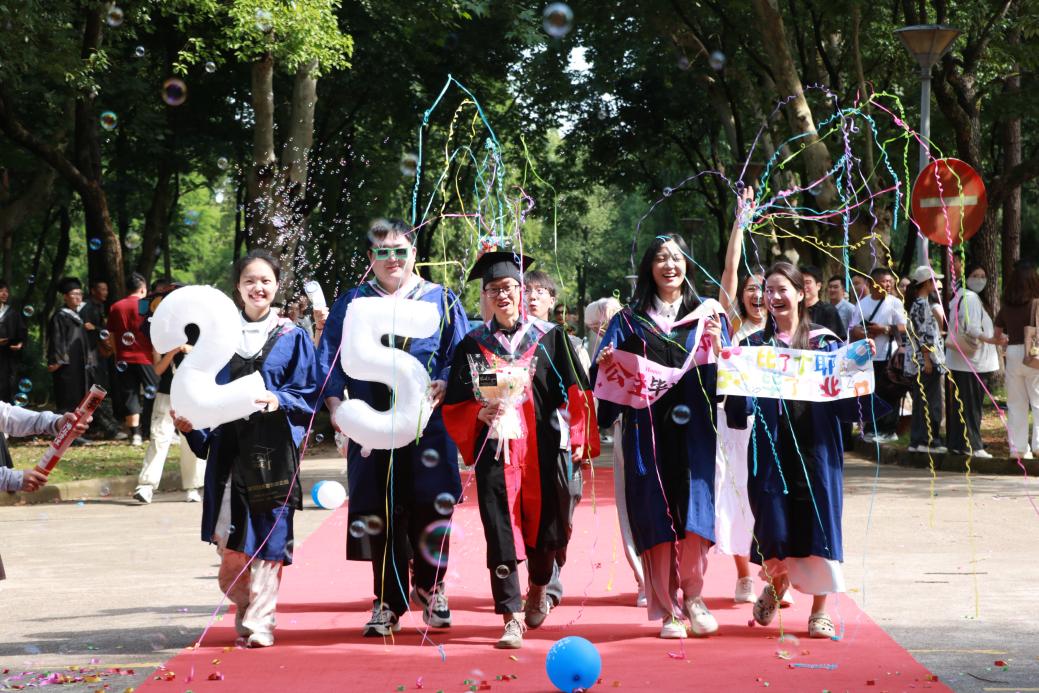 阳光轻洒,泡沫与彩带在空中轻盈飞舞;红毯铺展,荣耀与梦想在此汇聚。典礼开始前,2025 届毕业生在导师、班主任的带领下,意气风发地踏上红毯。他们身着学位服,面带笑容,迎接师长和同学们的鲜花与祝福,携手迈向充满无限可能的未来。