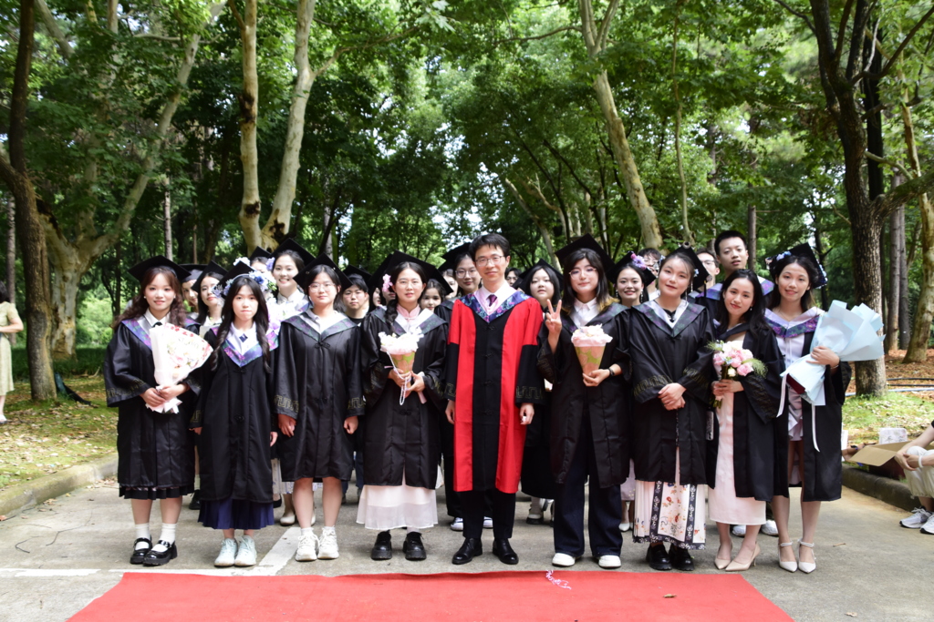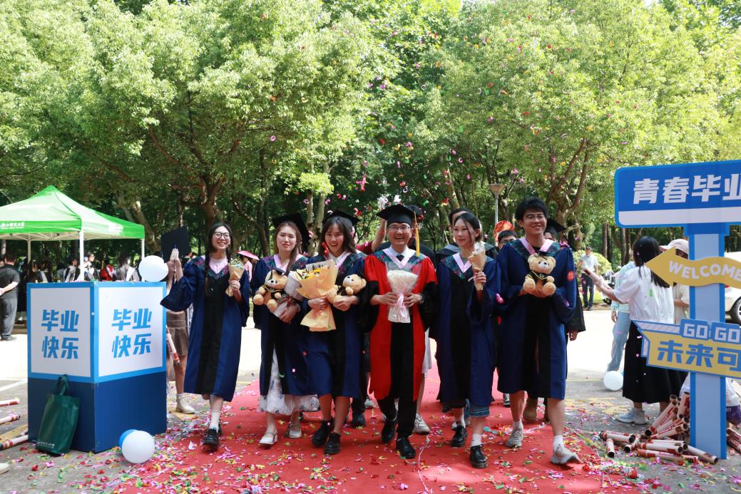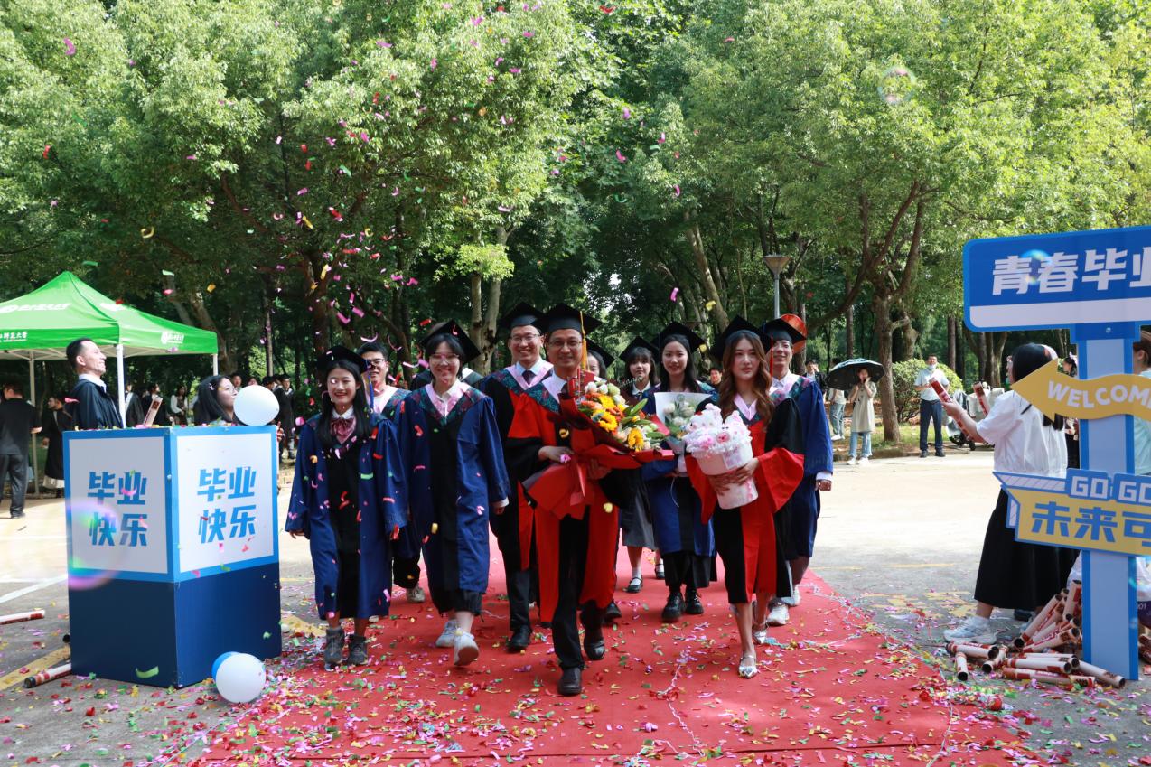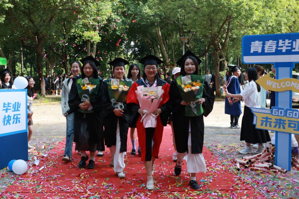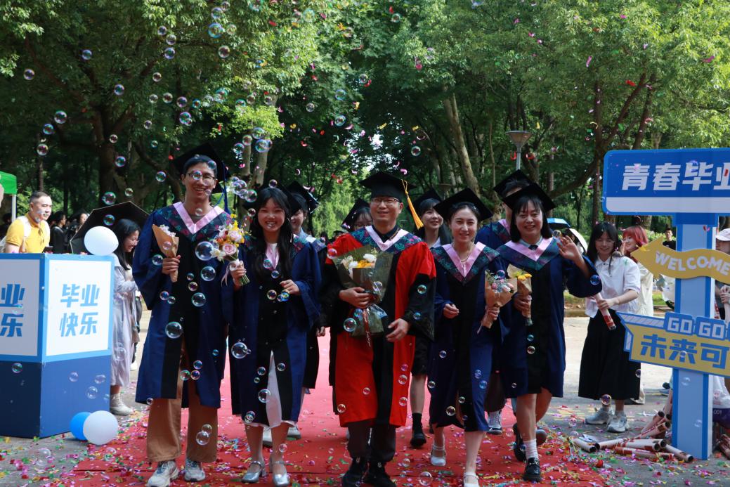 阳光轻洒,泡沫与彩带在空中轻盈飞舞;红毯铺展,荣耀与梦想在此汇聚。典礼开始前,2025 届毕业生在导师、班主任的带领下,意气风发地踏上红毯。他们身着学位服,面带笑容,迎接师长和同学们的鲜花与祝福,携手迈向充满无限可能的未来。