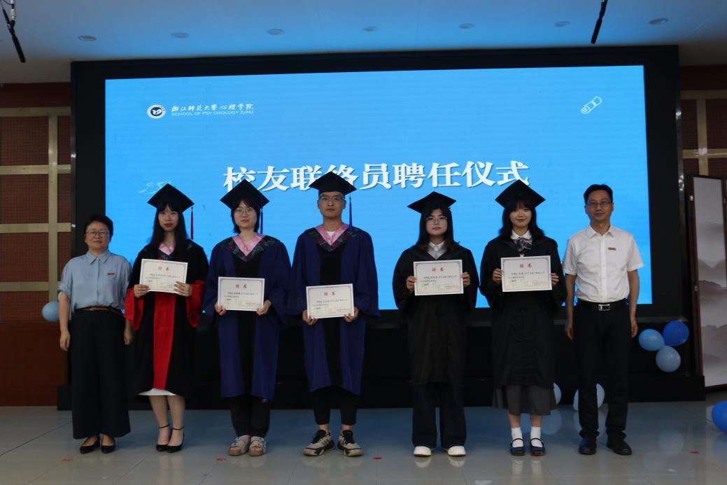 毕业不是散场,为持续深化校友联络网络,汇聚校友的爱校热忱与助校力量,以广泛联结绘就浙师心理发展同心圆。6名毕业生被聘选为校友联络员,院长孙炳海和党委书记马莉共同为校友联络员颁发聘书。