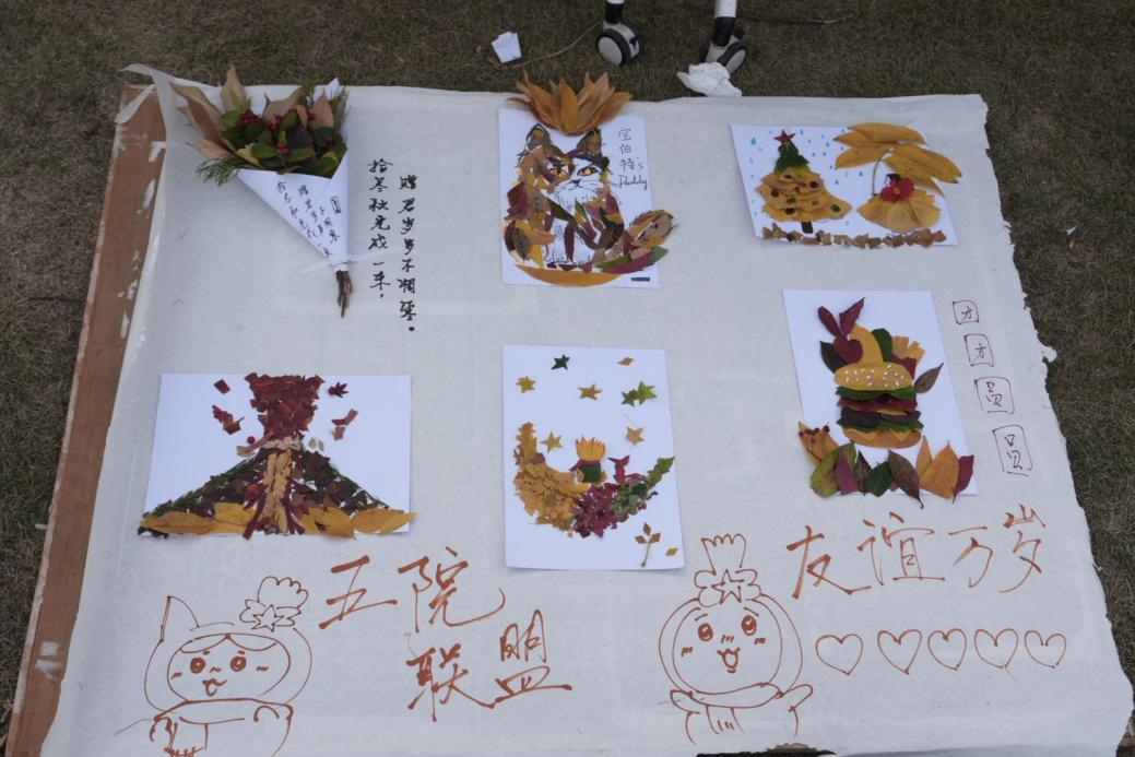 艺术学院“秋季共创——落叶拼贴”:引导队员们利用收集的落叶进行集体艺术创作,将自然之美与团队智慧凝结于一幅幅拼贴画中。